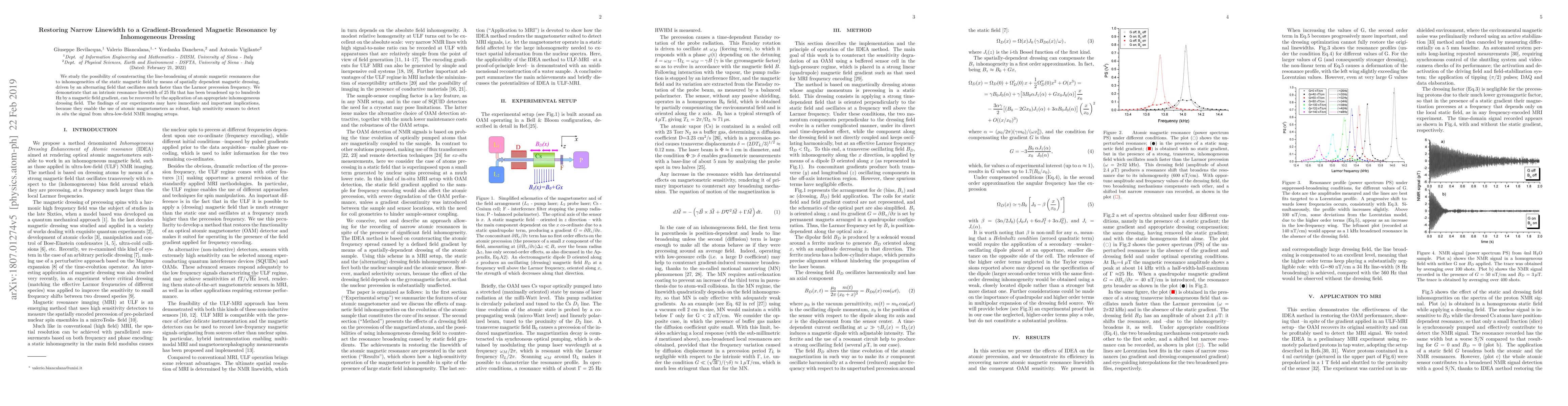 This paper investigates the restoration of narrow linewidth in atomic magnetic resonances that have been broadened by magnetic field inhomogeneities through spatially dependent magnetic dressing. The technique successfully recovers an intrinsic linewidth of 25 Hz, originally broadened to hundreds Hz, potentially enhancing the sensitivity and robustness of atomic magnetometers for ultra-low-field NMR imaging.