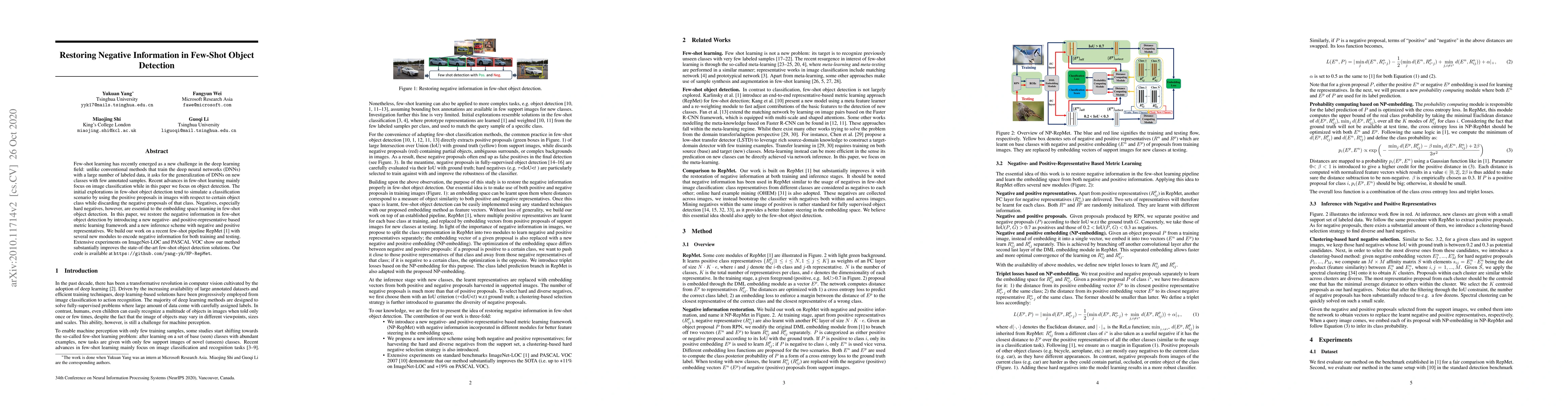 This paper proposes a new framework to restore negative information in few-shot object detection, introducing a metric learning approach with negative and positive representatives. Experiments on ImageNet-LOC and PASCAL VOC demonstrate significant improvements over existing methods.