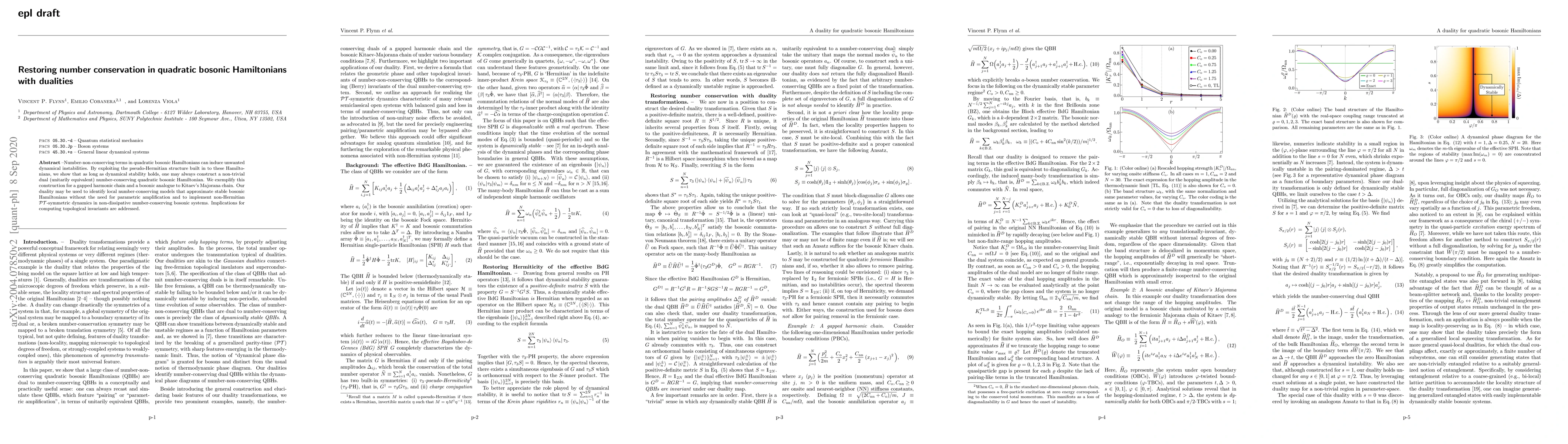 This paper demonstrates a method to restore number conservation in quadratic bosonic Hamiltonians by constructing dual, unitarily equivalent, number-conserving models using pseudo-Hermitian structures. This approach is exemplified in stable bosonic systems like a gapped harmonic chain and a bosonic Majorana chain, with implications for computing topological invariants.