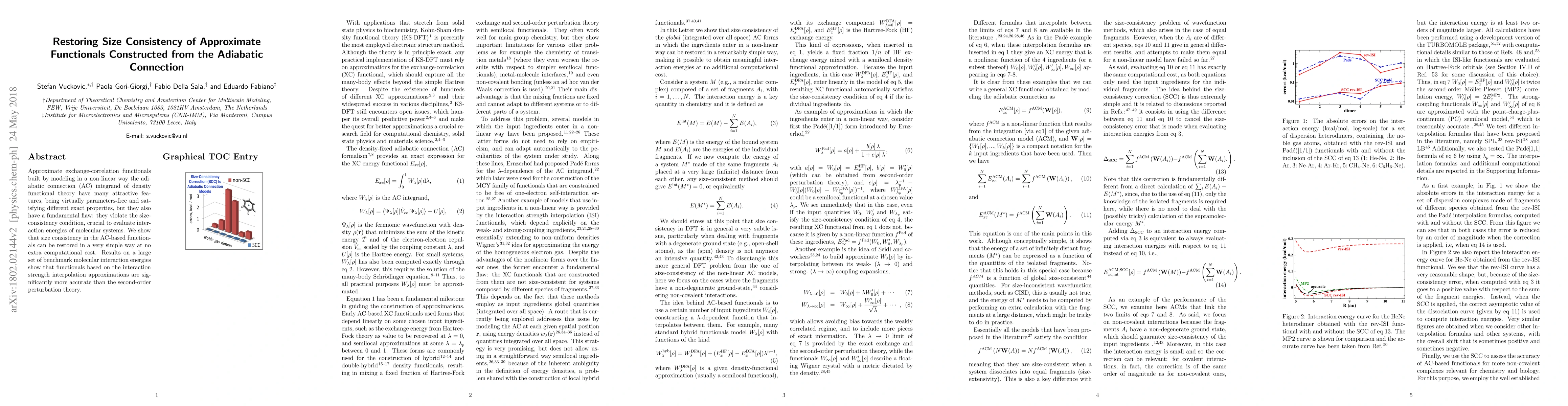 This paper addresses the issue of size inconsistency in approximate exchange-correlation functionals derived from the adiabatic connection in density functional theory. It proposes a straightforward method to restore size consistency without additional computational cost, demonstrating improved accuracy in evaluating molecular interaction energies compared to second-order perturbation theory.