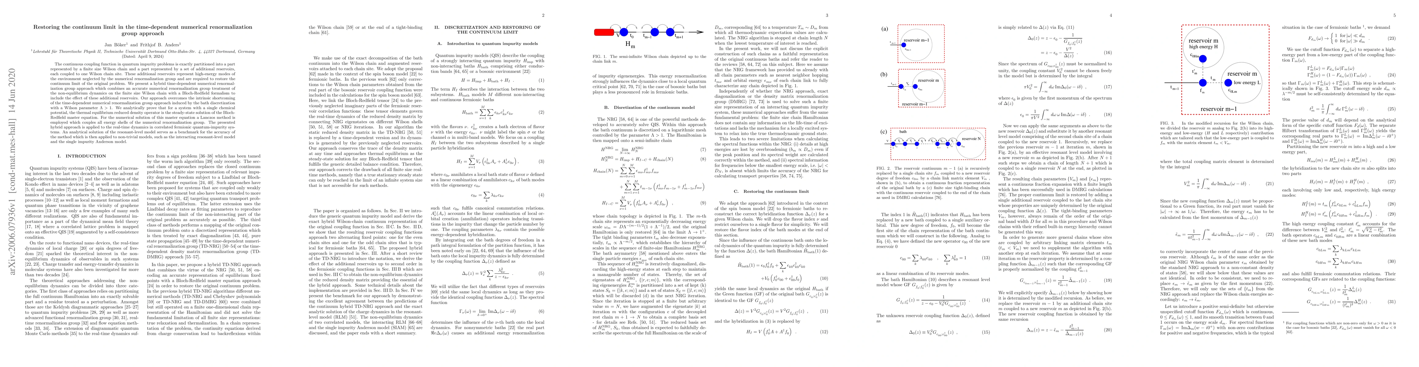 This paper introduces a hybrid time-dependent numerical renormalization group approach that combines the Wilson chain with additional reservoirs to restore the continuum limit in quantum impurity problems. The method uses a Bloch-Redfield formalism to accurately model the neglected high-energy modes, proving the thermal equilibrium density operator as the steady-state solution and employing the Lanczos method for numerical efficiency.