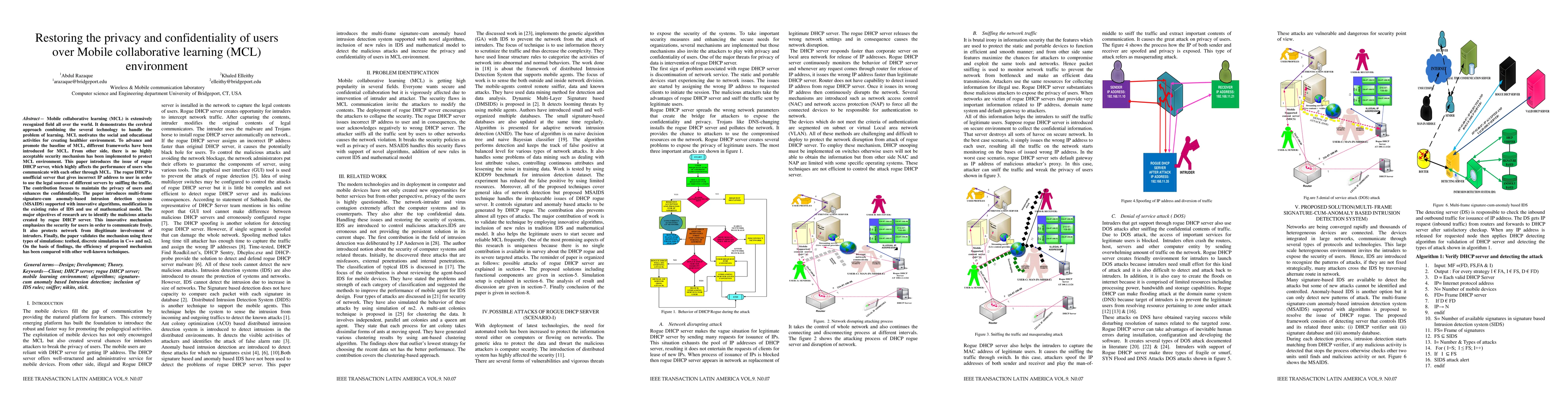 This paper addresses the security challenges in mobile collaborative learning (MCL) environments, particularly focusing on rogue DHCP servers that compromise user privacy and confidentiality. It proposes a multi-frame signature-cum anomaly-based intrusion detection system (MSAIDS) to detect and mitigate such attacks, validated through various simulations, demonstrating improved security over existing techniques.