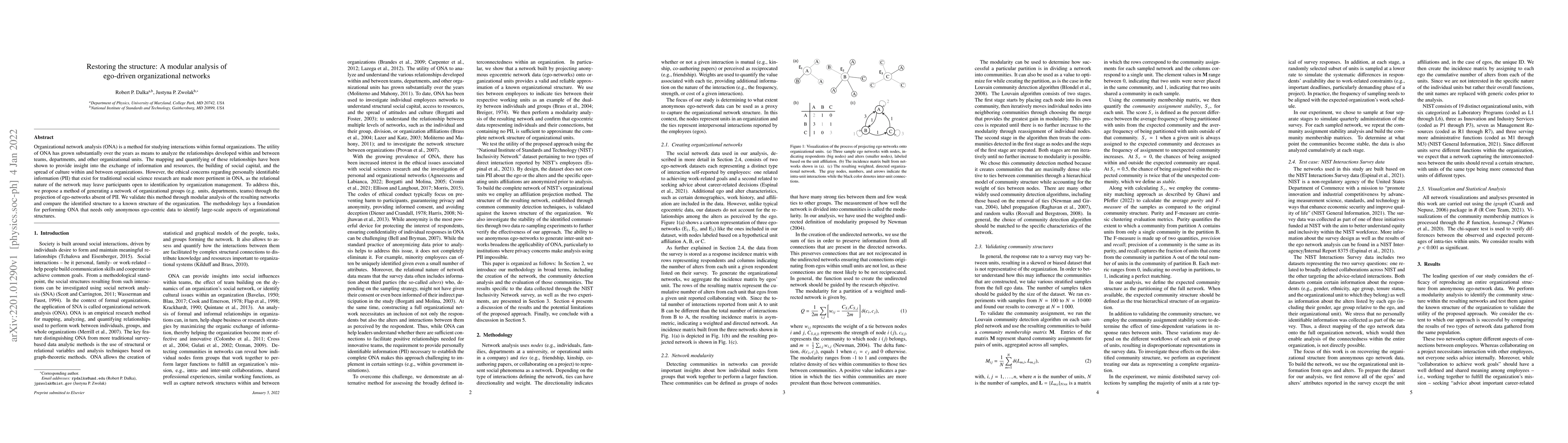 This paper proposes a method to generate anonymous organizational networks by projecting ego-networks without personally identifiable information, validated through modular analysis, to maintain ethical standards while analyzing organizational relationships. The approach aims to identify large-scale organizational structures using only anonymous ego-centric data.