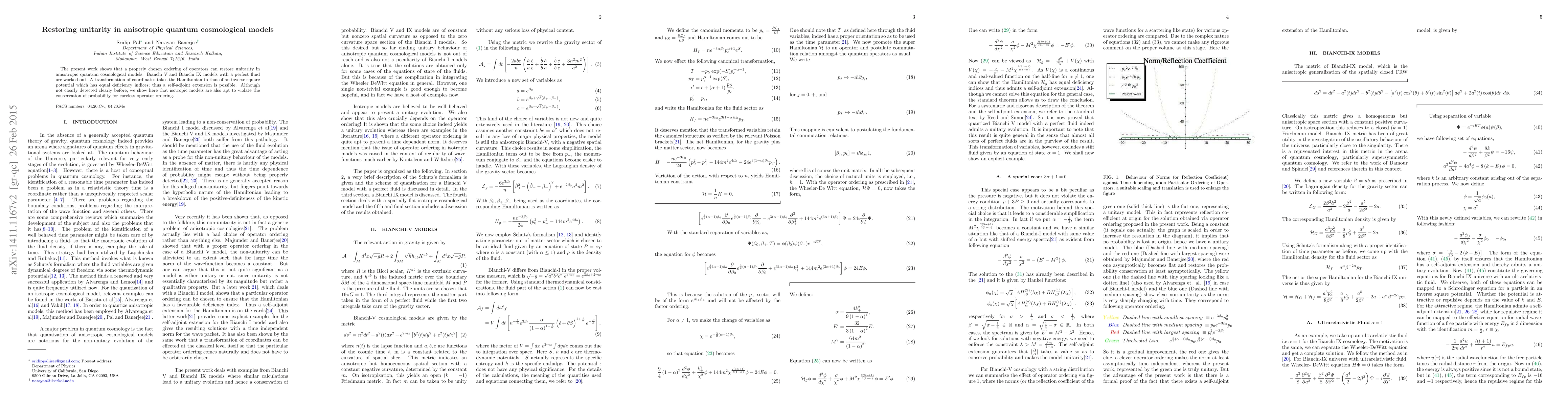 The present work shows that a properly chosen ordering of operators can restore unitarity in anisotropic quantum cosmological models. Bianch V and Bianchi IX models with a perfect fluid are worked out. It has been shown that a transformation of coordinates takes the Hamiltonian to that of an inverse square potential which has equal deficiency indices and a self-adjoint extension is thus possible. It is also shown, although not detected clearly before, that isotropic models are also apt to violate the conservation of probability for a careless operator ordering.