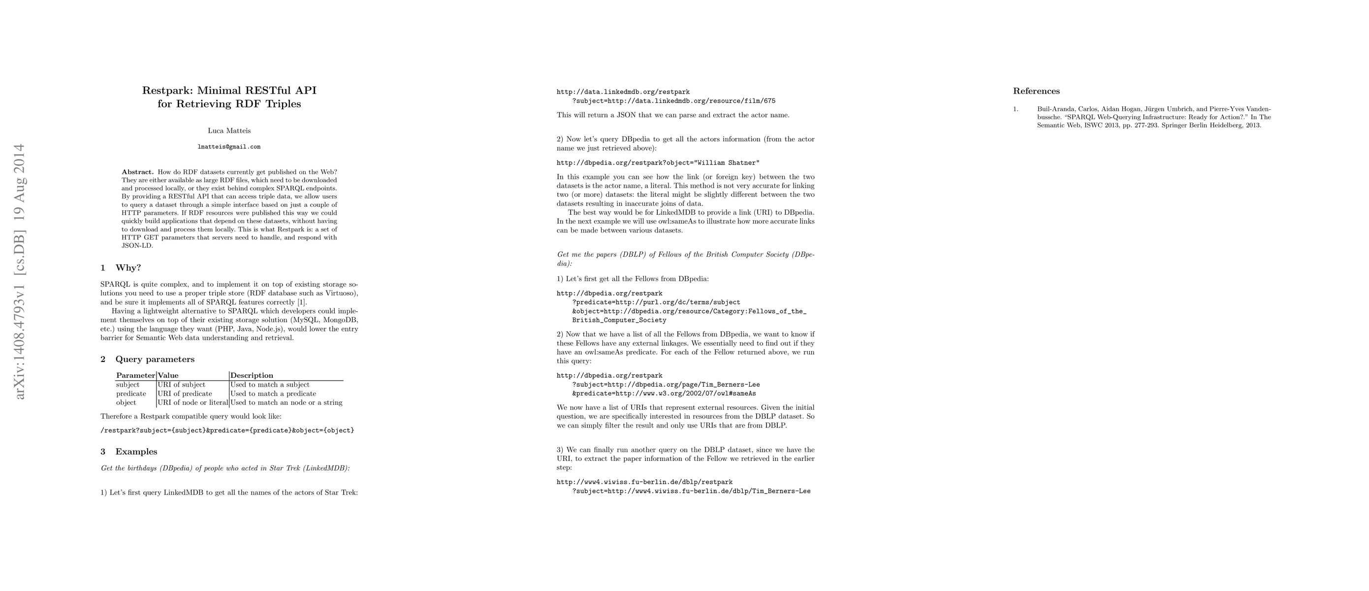How do RDF datasets currently get published on the Web? They are either available as large RDF files, which need to be downloaded and processed locally, or they exist behind complex SPARQL endpoints. By providing a RESTful API that can access triple data, we allow users to query a dataset through a simple interface based on just a couple of HTTP parameters. If RDF resources were published this way we could quickly build applications that depend on these datasets, without having to download and process them locally. This is what Restpark is: a set of HTTP GET parameters that servers need to handle, and respond with JSON-LD.
