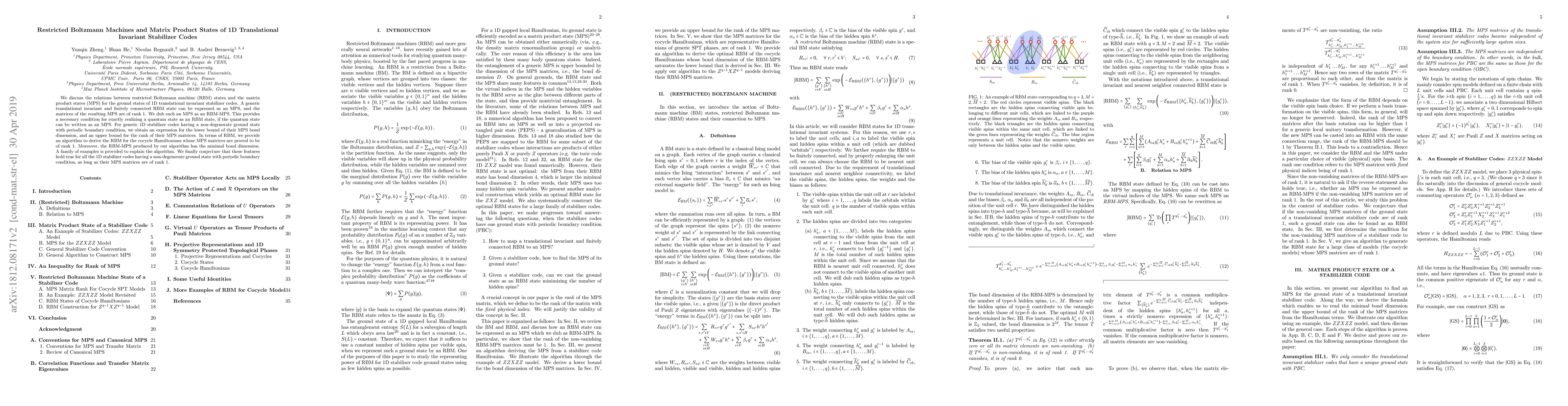 This paper explores the connection between restricted Boltzmann machine (RBM) states and matrix product states (MPS) for 1D translational invariant stabilizer codes. It demonstrates that generic RBM states can be expressed as minimal bond dimension MPS, termed RBM-MPS, with rank 1 matrices, providing necessary conditions for realizing quantum states as RBM states.