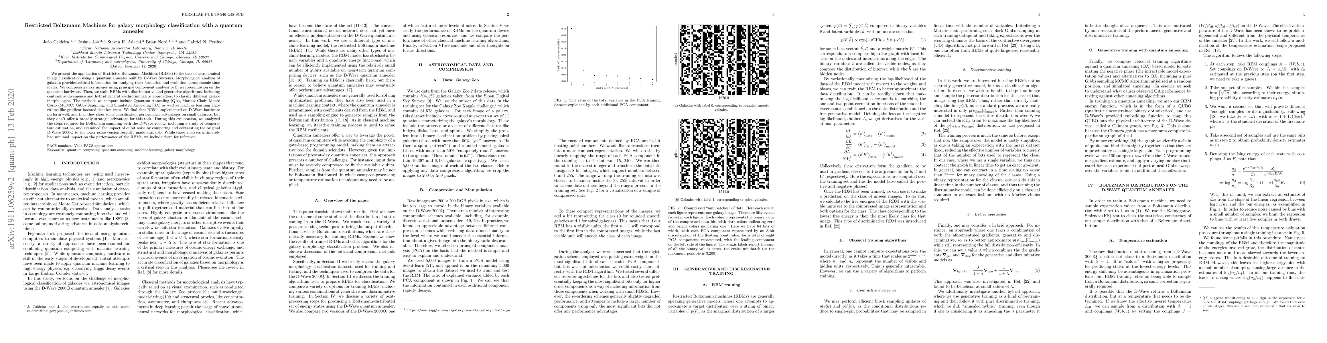 This paper explores the use of Restricted Boltzmann Machines (RBMs) on a quantum annealer for classifying galaxy morphologies, finding that while RBMs perform well on small datasets, they do not provide a broad strategic advantage over traditional methods. The study also investigates the impact of qubit noise and temperature estimation on the quantum hardware's performance.