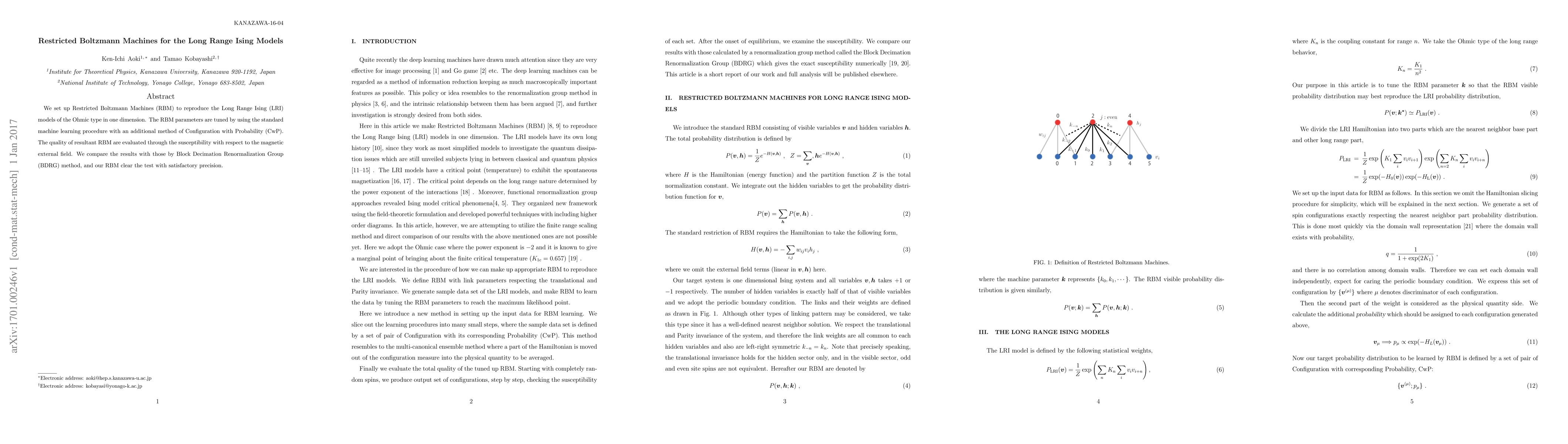 This paper employs Restricted Boltzmann Machines (RBM) to model one-dimensional Long Range Ising models, tuning parameters via a Configuration with Probability method. The RBM's performance is evaluated against the Block Decimation Renormalization Group method, showing satisfactory precision.