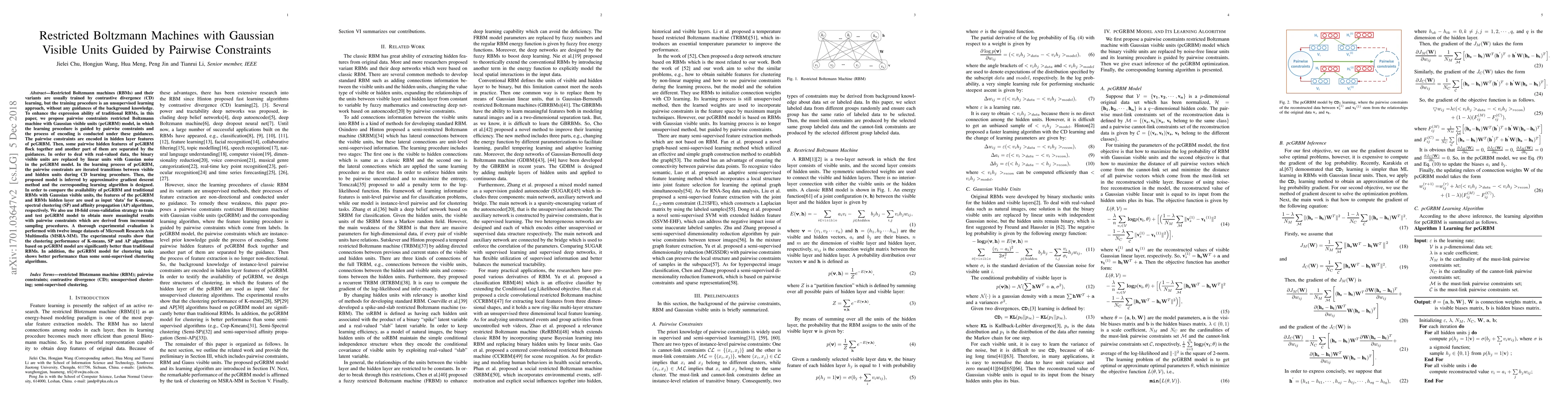 Restricted Boltzmann machines (RBMs) and their variants are usually trained by contrastive divergence (CD) learning, but the training procedure is an unsupervised learning approach, without any guidances of the background knowledge. To enhance the expression ability of traditional RBMs, in this paper, we propose pairwise constraints restricted Boltzmann machine with Gaussian visible units (pcGRBM) model, in which the learning procedure is guided by pairwise constraints and the process of encoding is conducted under these guidances. The pairwise constraints are encoded in hidden layer features of pcGRBM. Then, some pairwise hidden features of pcGRBM flock together and another part of them are separated by the guidances. In order to deal with real-valued data, the binary visible units are replaced by linear units with Gausian noise in the pcGRBM model. In the learning process of pcGRBM, the pairwise constraints are iterated transitions between visible and hidden units during CD learning procedure. Then, the proposed model is inferred by approximative gradient descent method and the corresponding learning algorithm is designed in this paper. In order to compare the availability of pcGRBM and traditional RBMs with Gaussian visible units, the features of the pcGRBM and RBMs hidden layer are used as input 'data' for K-means, spectral clustering (SP) and affinity propagation (AP) algorithms, respectively. A thorough experimental evaluation is performed with sixteen image datasets of Microsoft Research Asia Multimedia (MSRA-MM). The experimental results show that the clustering performance of K-means, SP and AP algorithms based on pcGRBM model are significantly better than traditional RBMs. In addition, the pcGRBM model for clustering task shows better performance than some semi-supervised clustering algorithms.