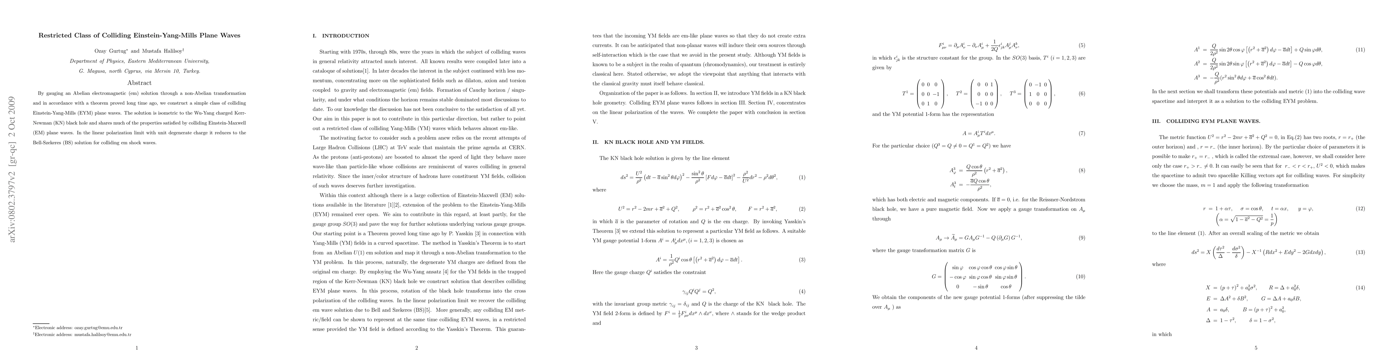 This paper constructs a restricted class of colliding Einstein-Yang-Mills plane waves by gauging an Abelian electromagnetic solution through a non-Abelian transformation, resulting in a solution isometric to the Wu-Yang charged Kerr-Newman black hole. The solution shares properties with colliding Einstein-Maxwell plane waves and reduces to the Bell-Szekeres solution in the linear polarization limit.