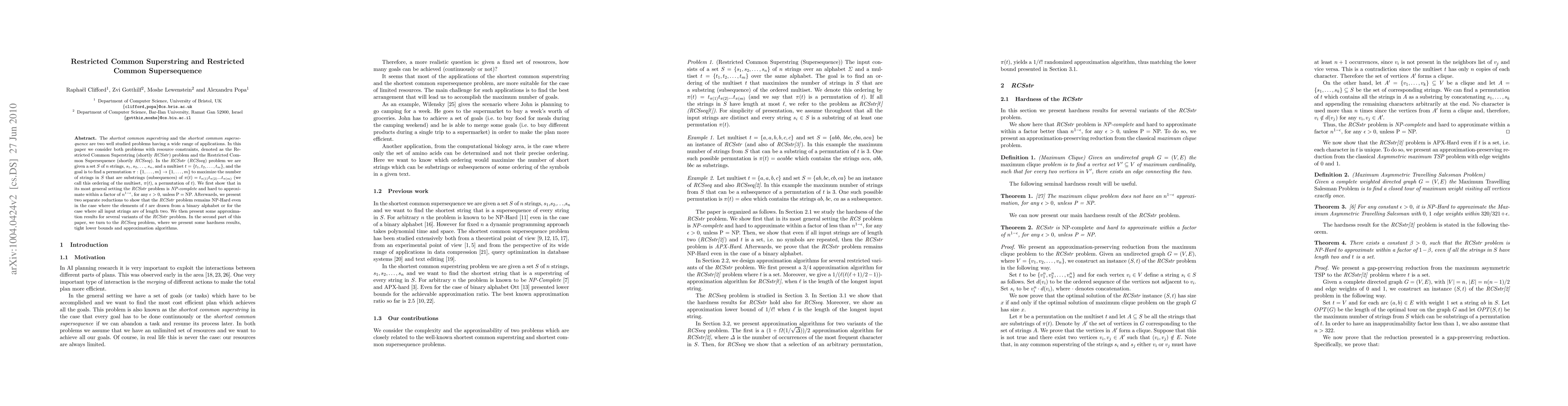 Researchers study two computational problems, Restricted Common Superstring (RCSstr) and Restricted Common Supersequence (RCSseq), with resource constraints to find optimal permutations that maximize the number of substrings or subsequences from a given set of strings.