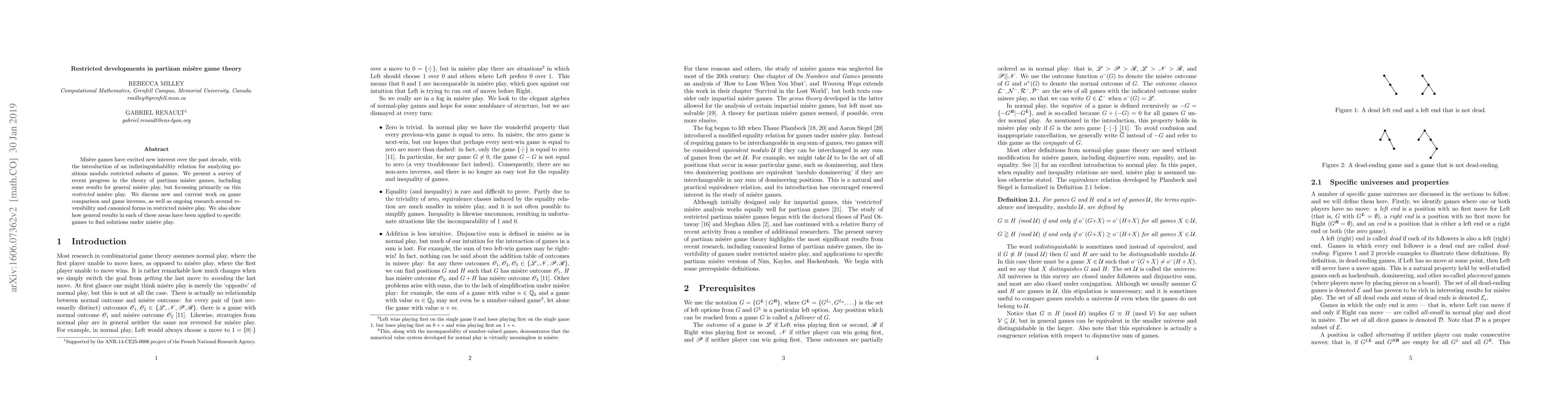 This paper surveys recent advancements in restricted misere game theory, highlighting unique properties such as additive inverses that differ from simple negations and reversible positions through ends, which are not possible in normal or general misere play. It also discusses related open problems.