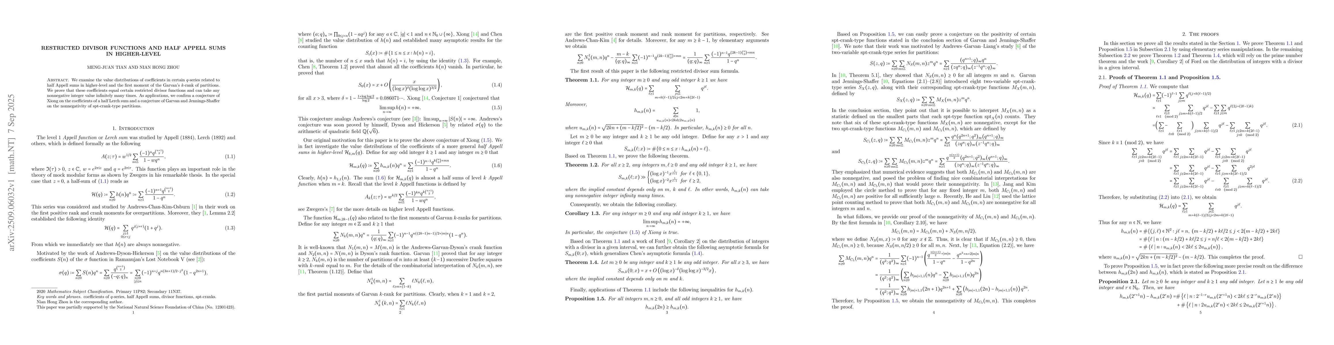 We examine the value distributions of coefficients in certain $q$-series related to half Appell sums in higher-level and the first moment of the Garvan's $k$-rank of partitions. We prove that these coefficients equal certain restricted divisor functions and can take any nonnegative integer value infinitely many times. As applications, we confirm a conjecture of Xiong on the coefficients of a half Lerch sum and a conjecture of Garvan and Jennings-Shaffer on the nonnegativity of spt-crank-type partitions.
