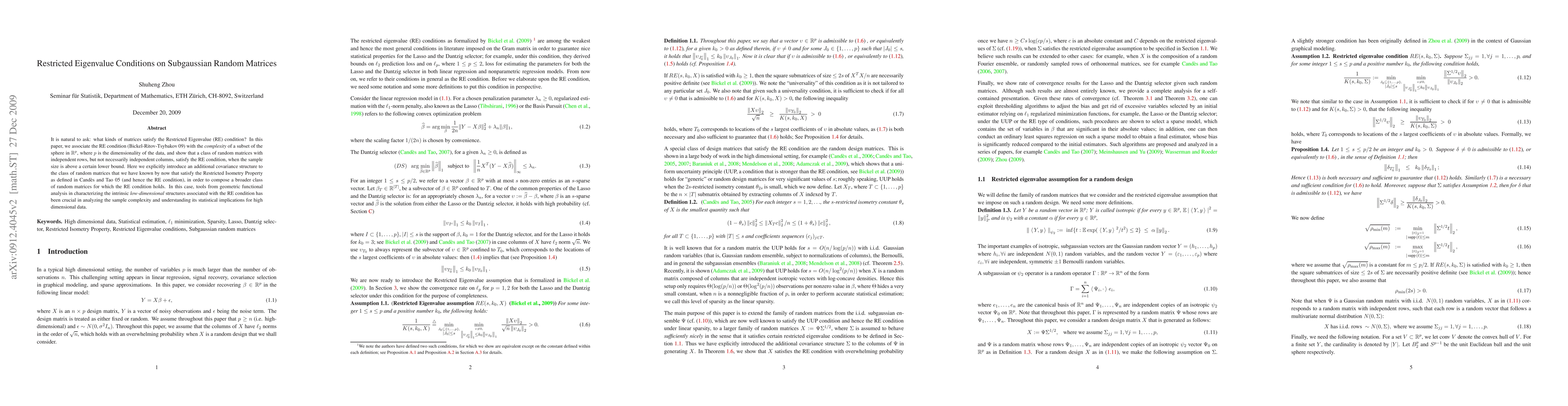 This paper explores the Restricted Eigenvalue (RE) condition for a class of subgaussian random matrices with independent rows but not necessarily independent columns. It introduces an additional covariance structure to broaden the class of matrices satisfying the RE condition, using tools from geometric functional analysis to analyze sample complexity and its statistical implications for high-dimensional data.