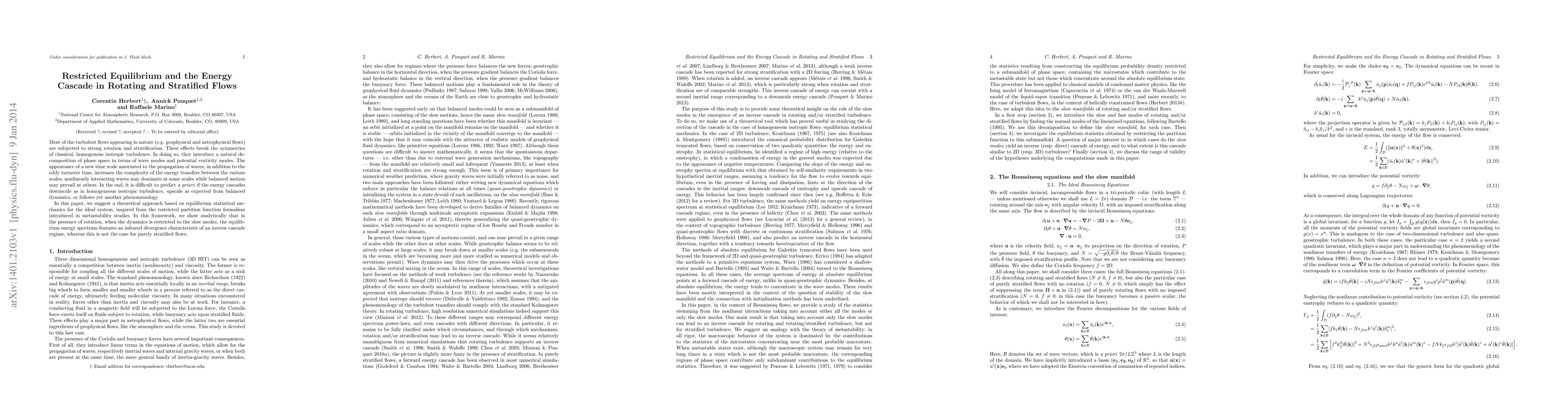 This paper proposes a theoretical framework based on equilibrium statistical mechanics to analyze energy cascades in rotating and stratified turbulent flows. It demonstrates analytically that rotation, when restricted to slow modes, leads to an infrared divergence in the energy spectrum, indicating an inverse cascade regime, unlike purely stratified flows.