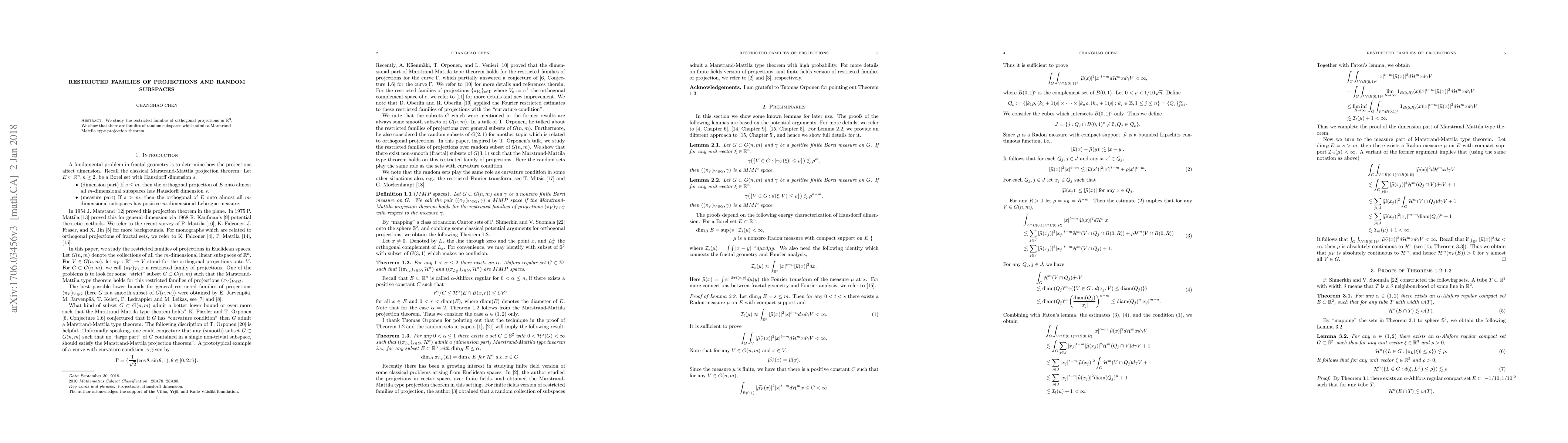 Summary: This paper investigates specific families of orthogonal projections in three-dimensional space and demonstrates the existence of random subspaces that satisfy a Marstrand-Mattila type projection theorem, highlighting their unique properties.