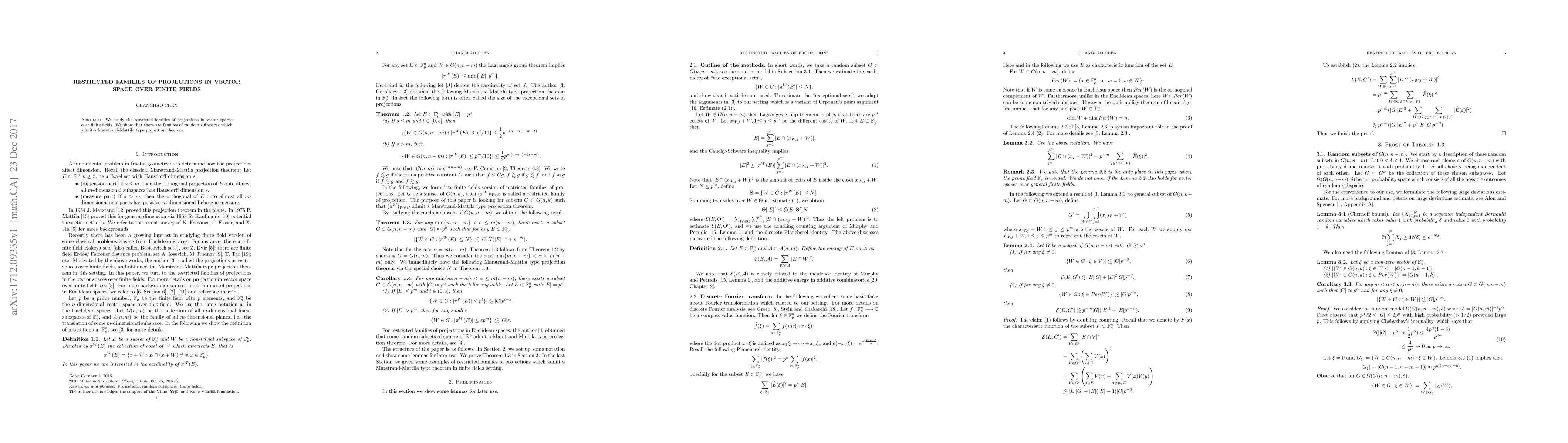 Summary: This paper investigates restricted families of projections in vector spaces over finite fields, demonstrating the existence of random subspaces that satisfy a Marstrand-Mattila type projection theorem, thereby extending similar results from Euclidean spaces to finite fields.