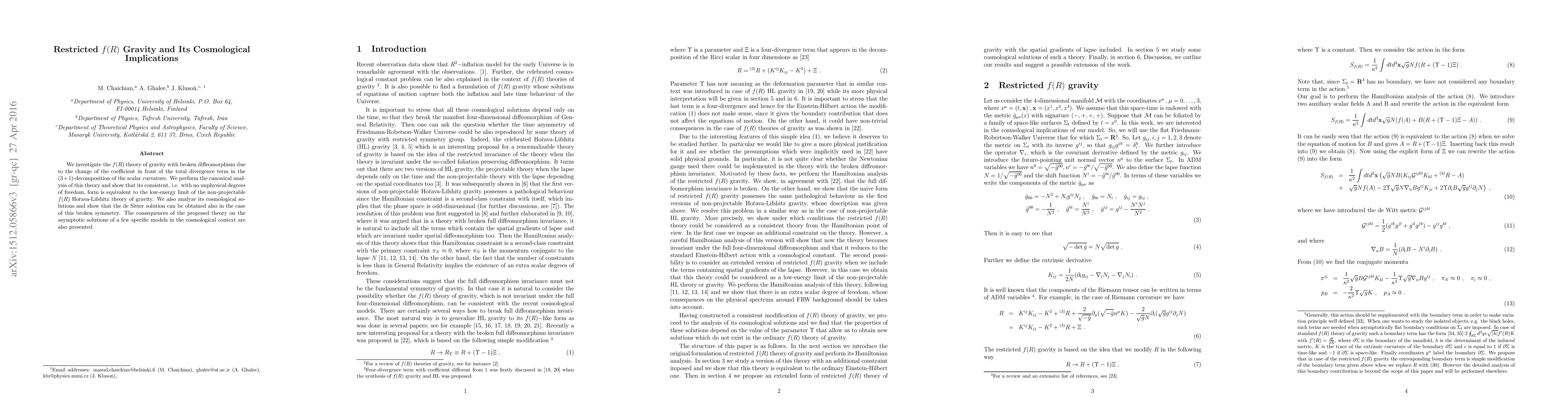 This paper explores restricted f(R) gravity with broken diffeomorphism and demonstrates its consistency without unphysical degrees of freedom. It shows that this theory is equivalent to the low-energy limit of non-projectable f(R) Horava-Lifshitz gravity and presents cosmological implications, including the possibility of a de Sitter solution.