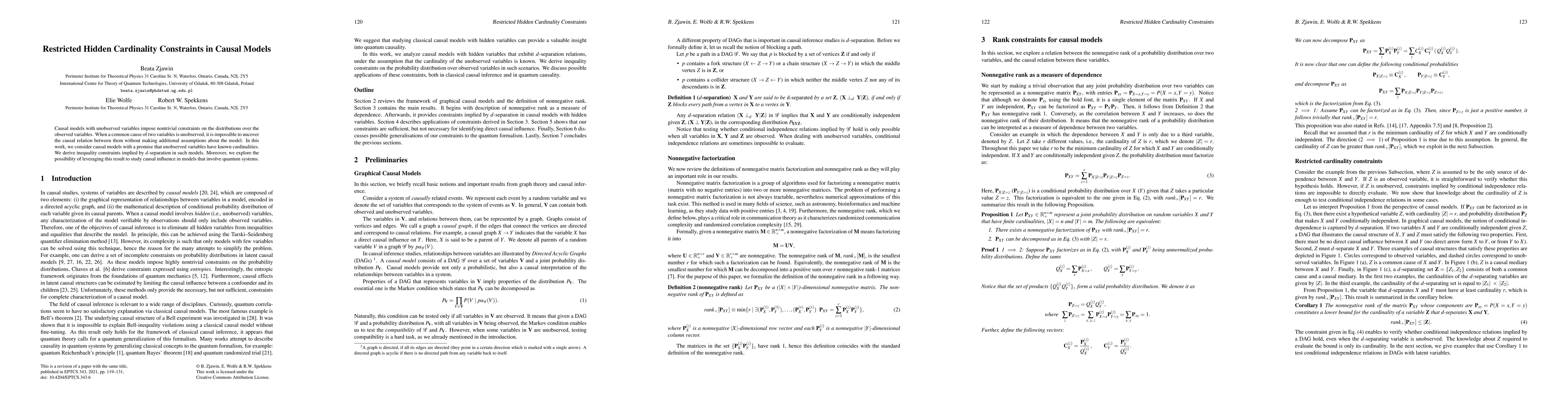 This paper investigates causal models with unobserved variables and known cardinalities of these unobserved variables, deriving inequality constraints from d-separation. It also explores the implications for studying causal influence in quantum systems.