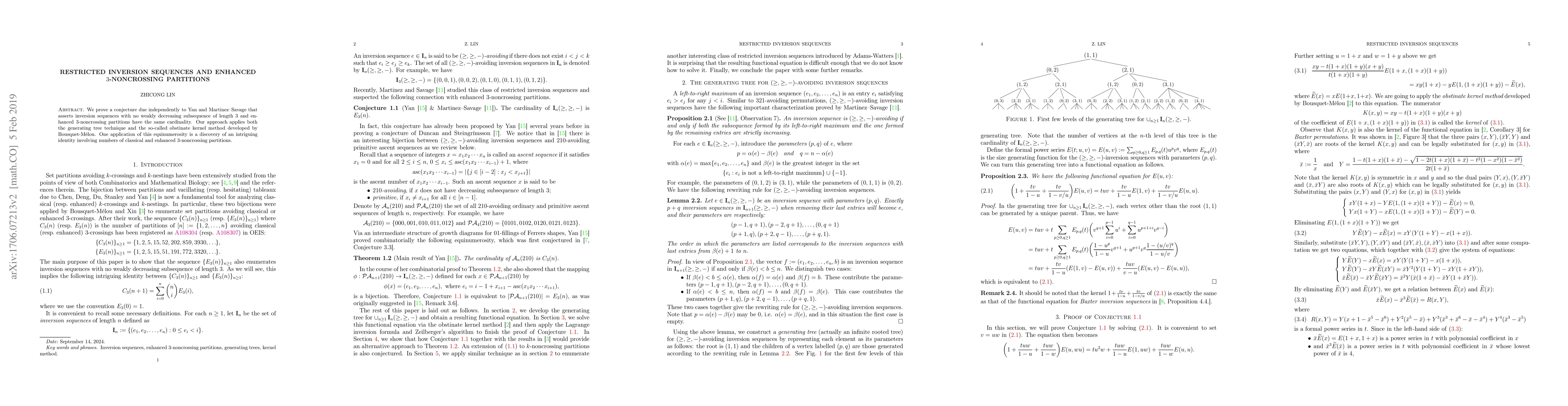 This paper proves a conjecture linking inversion sequences with no weakly decreasing subsequence of length 3 and enhanced $3$-noncrossing partitions, showing they have the same cardinality. The proof utilizes generating tree techniques and the obstinate kernel method.