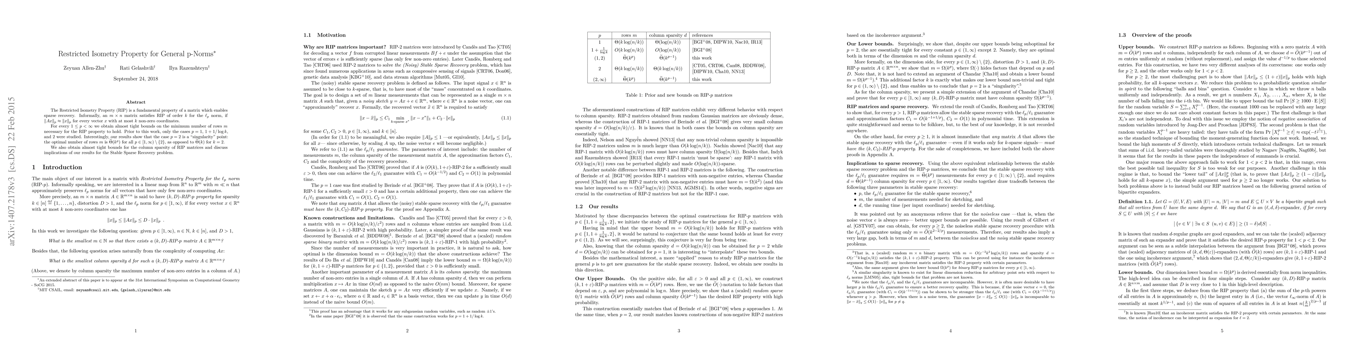 The Restricted Isometry Property (RIP) is a fundamental property of a matrix which enables sparse recovery. Informally, an $m \times n$ matrix satisfies RIP of order $k$ for the $\ell_p$ norm, if $\|Ax\|_p \approx \|x\|_p$ for every vector $x$ with at most $k$ non-zero coordinates. For every $1 \leq p < \infty$ we obtain almost tight bounds on the minimum number of rows $m$ necessary for the RIP property to hold. Prior to this work, only the cases $p = 1$, $1 + 1 / \log k$, and $2$ were studied. Interestingly, our results show that the case $p = 2$ is a "singularity" point: the optimal number of rows $m$ is $\widetilde{\Theta}(k^{p})$ for all $p\in [1,\infty)\setminus \{2\}$, as opposed to $\widetilde{\Theta}(k)$ for $k=2$. We also obtain almost tight bounds for the column sparsity of RIP matrices and discuss implications of our results for the Stable Sparse Recovery problem.