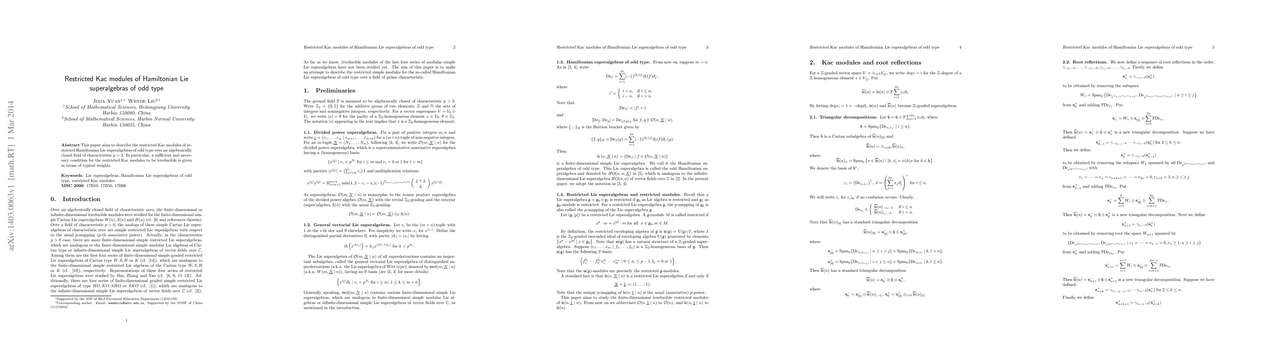 This paper aims to describe the restricted Kac modules of restricted Hamiltonian Lie superalgebras of odd type over an algebraically closed field of characteristic $p>3$. In particular, a sufficient and necessary condition for the restricted Kac modules to be irreducible is given in terms of typical weights.