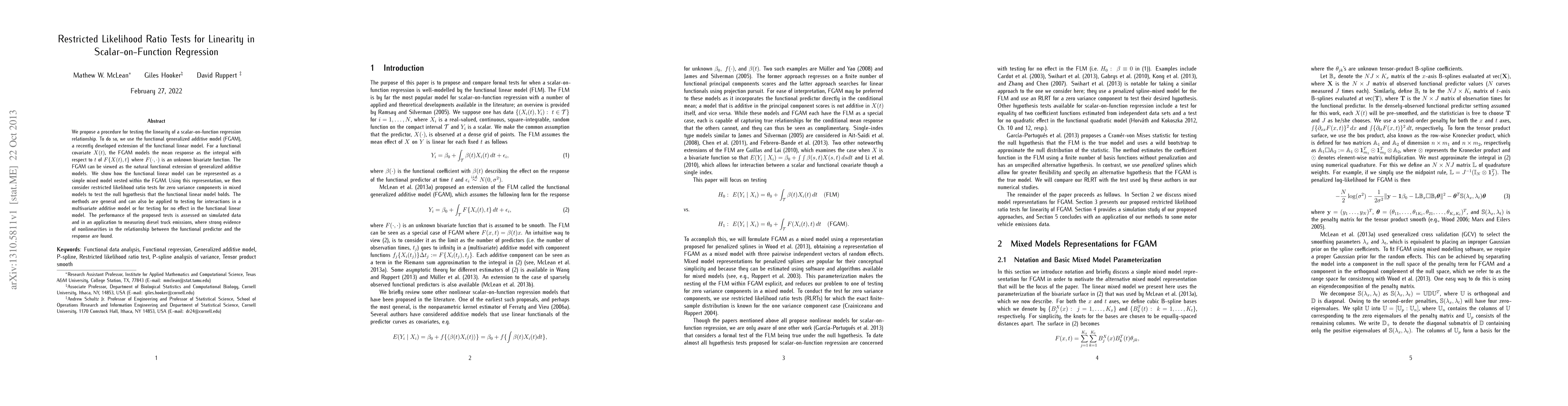 This paper proposes a method for testing linearity in scalar-on-function regression using the functional generalized additive model (FGAM). It employs restricted likelihood ratio tests to assess the null hypothesis of a functional linear model, demonstrating its application in analyzing diesel truck emissions data.