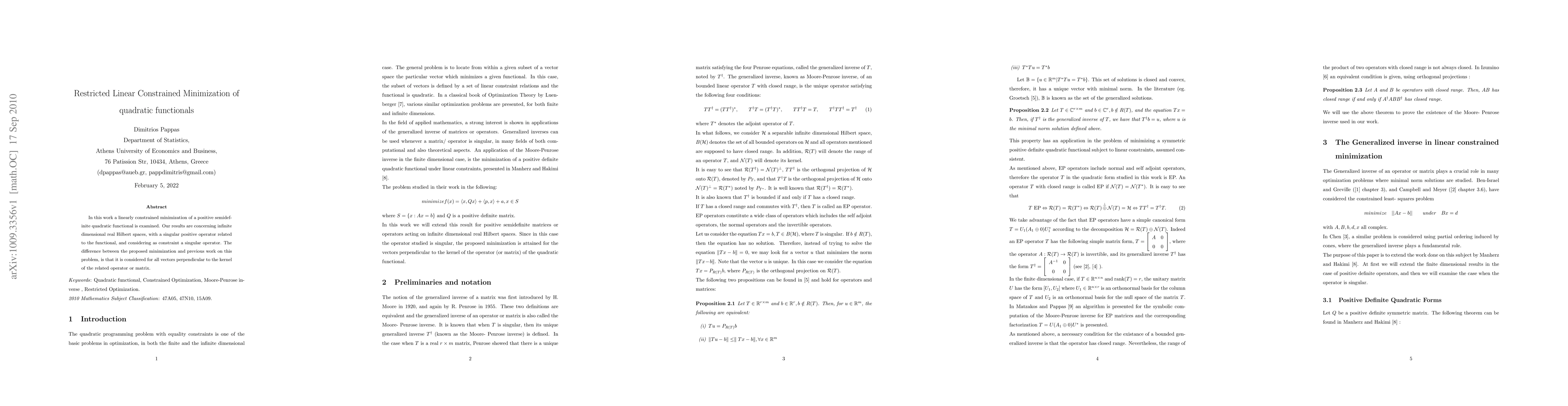 Researchers examine the minimization of positive semidefinite quadratic functionals in infinite-dimensional Hilbert spaces with singular operators as constraints, offering a new approach that considers vectors perpendicular to the kernel of these operators.