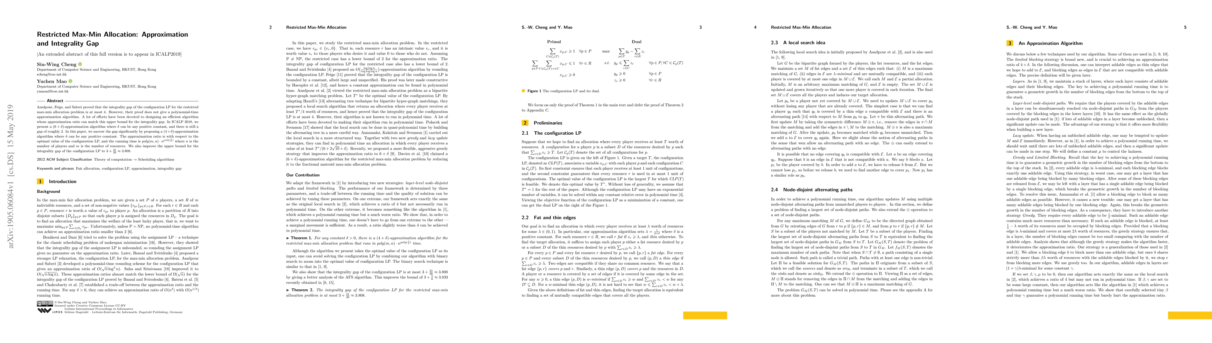 This paper presents a $(4+\delta)$-approximation algorithm for the restricted max-min allocation problem, improving upon previous $(6+\delta)$-approximation methods. The algorithm runs in $\mathit{poly}(m,n)\cdot n^{\mathit{poly}(\frac{1}{\delta})}$ time and reduces the integrality gap of the configuration LP to approximately $3.808$.