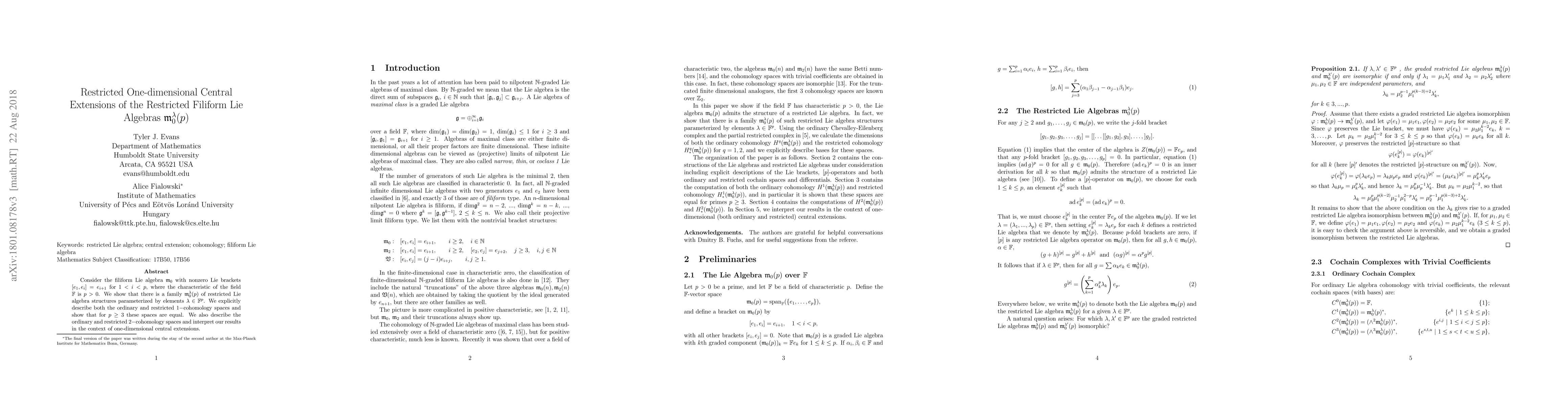 We show, for a field ${\mathbb F}$ of prime characteristic $p>0$, that the truncated filiform Lie algebra ${\frak m}_0(p)$ admits a family ${\frak m}_0^\lambda(p)$ of restricted Lie algebra structures parameterized by elements $\lambda\in {\mathbb F}^p$. We compute the ordinary cohomology groups $H^q({\frak m}_0^\lambda(p))$ and restricted cohomology groups $H^q_*({\frak m}_0^\lambda(p))$ for $q=1, 2$, and we give explicit descriptions of bases for these cohomology spaces. We apply our results to restricted one-dimensional central Extensions of the algebras ${\frak m}_0^\lambda(p)$.