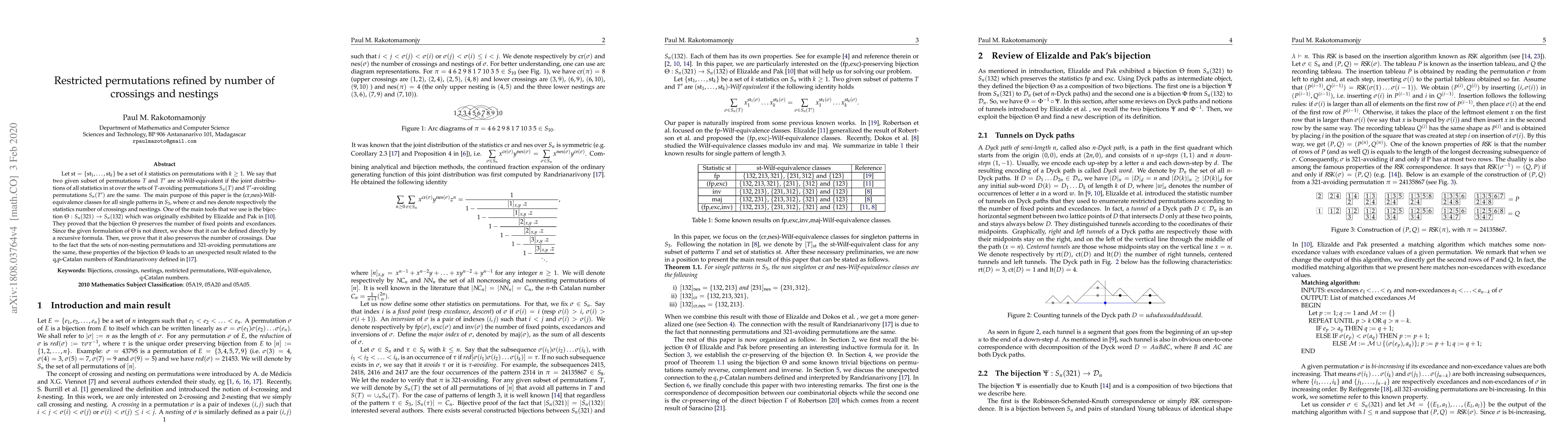 This paper investigates the (cr,nes)-Wilf-equivalence classes for single patterns in $S_3$, where cr and nes represent the number of crossings and nestings, respectively. It utilizes a bijection $\Theta$ from Elizalde and Pak to show that it preserves the number of crossings, leading to insights into the q,p-Catalan numbers.