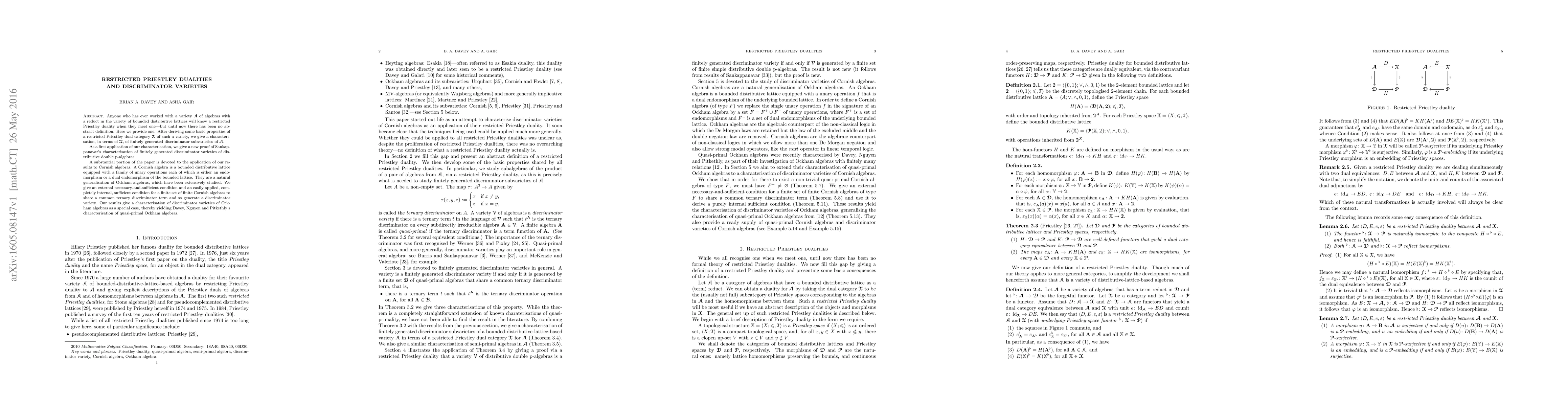 Researchers provide an abstract definition of restricted Priestley dualities and characterise finitely generated discriminator subvarieties of algebras, including a new proof and application to Cornish algebras.