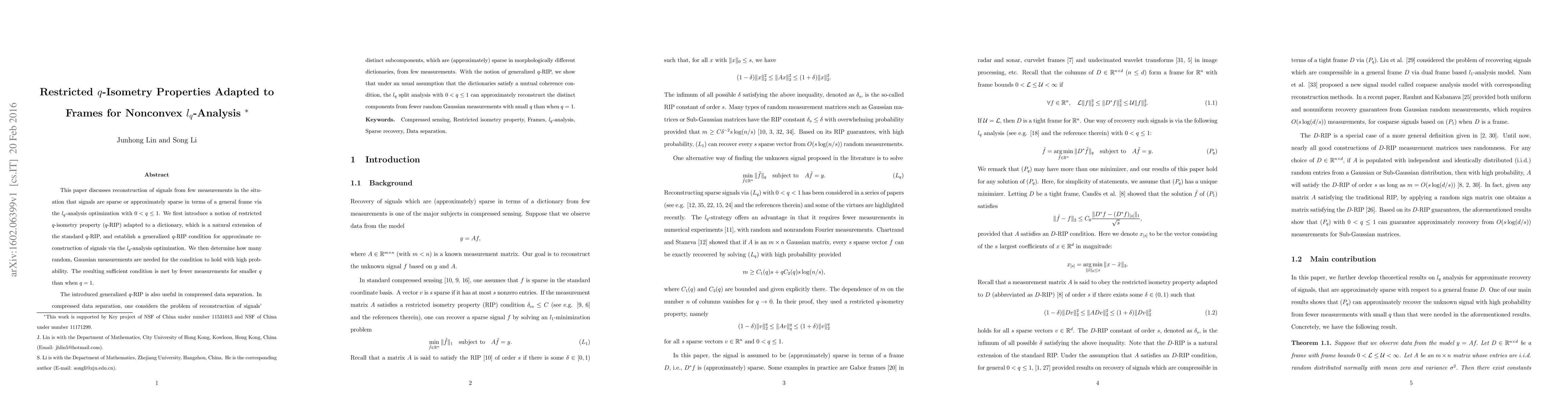 This paper introduces a generalized restricted $q$-isometry property ($q$-RIP) for sparse signal reconstruction via $l_q$-analysis optimization with $0<q\leq1$, determining fewer measurements needed for reconstruction compared to $q=1$. It also applies this concept to compressed data separation, showing that distinct components can be reconstructed with fewer measurements when $q$ is smaller.