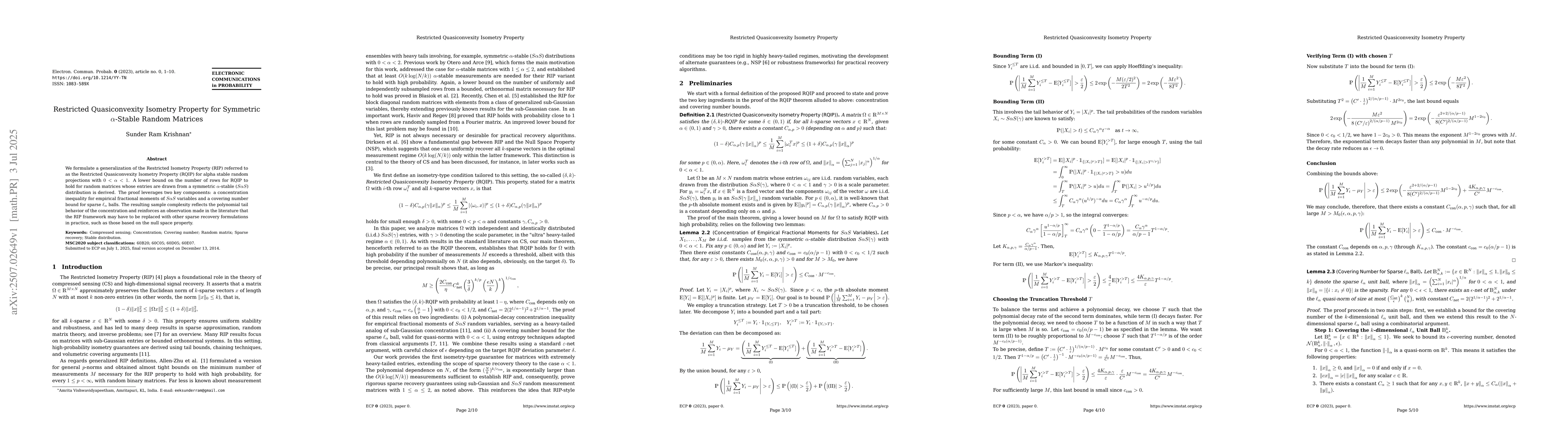 We formulate a generalization of the Restricted Isometry Property (RIP) referred to as the Restricted Quasiconvexity Isometry Property (RQIP) for alpha stable random projections with $0<\alpha<1$. A lower bound on the number of rows for RQIP to hold for random matrices whose entries are drawn from a symmetric $\alpha$-stable ($S\alpha S$) distribution is derived. The proof leverages two key components: a concentration inequality for empirical fractional moments of $S\alpha S$ variables and a covering number bound for sparse $\ell_\alpha$ balls. The resulting sample complexity reflects the polynomial tail behavior of the concentration and reinforces an observation made in the literature that the RIP framework may have to be replaced with other sparse recovery formulations in practice, such as those based on the null space property.
