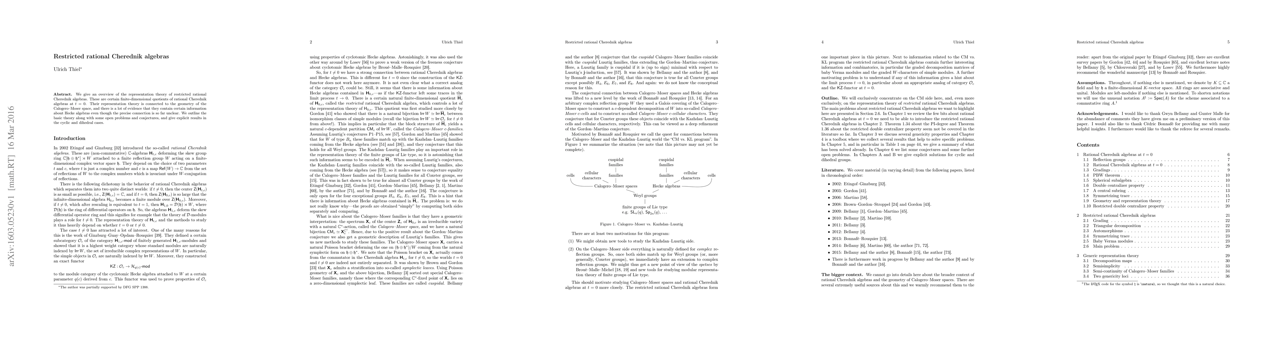 This paper provides an overview of the representation theory of restricted rational Cherednik algebras, which are finite-dimensional quotients of rational Cherednik algebras at t=0. It explores their connections to the geometry of Calogero-Moser space and potential links to Hecke algebras, while also presenting explicit results for cyclic and dihedral cases.