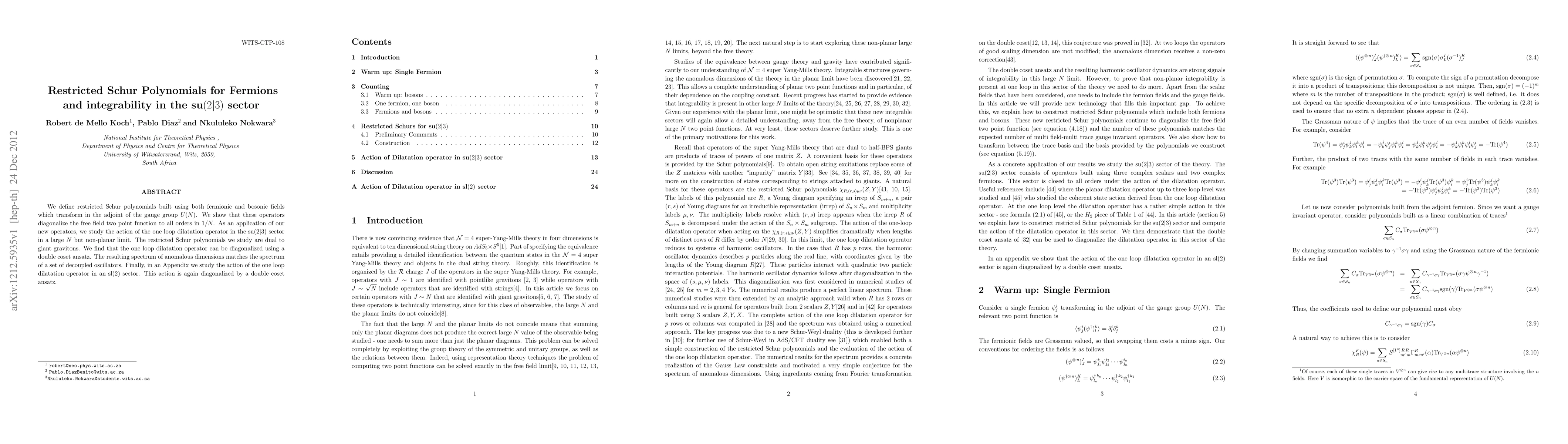 The paper introduces restricted Schur polynomials for fermions and bosons, showing they diagonalize free field two-point functions in U(N) gauge theories. These operators are applied to study the one-loop dilatation operator in the su(2|3) sector under large N, non-planar conditions. The spectrum is found to match decoupled oscillator results, and a similar diagonalization via double coset ansatz is observed in the sl(2) sector.