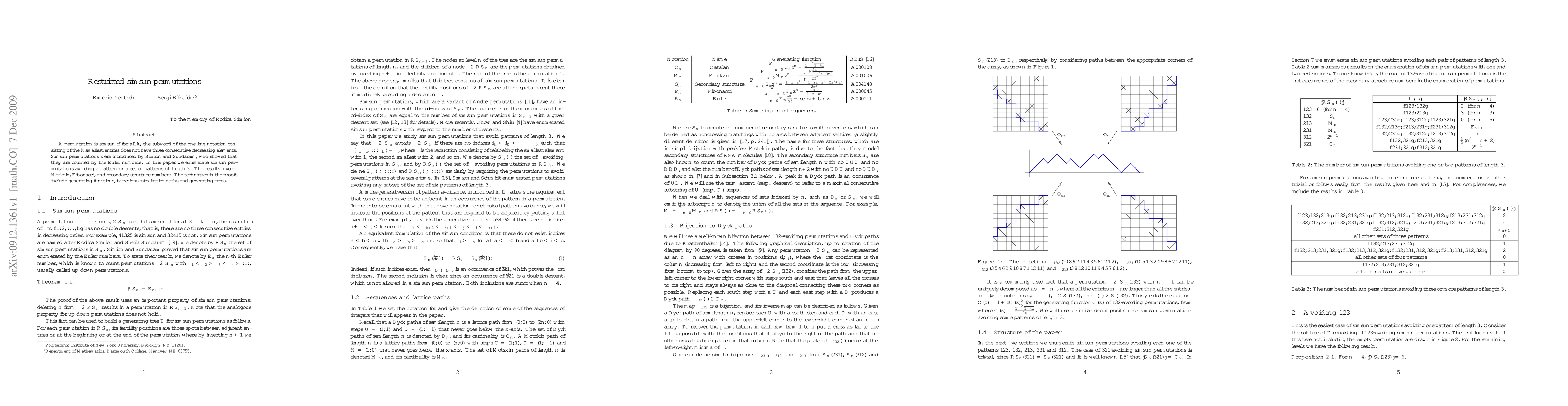 Researchers studied simsun permutations, specifically those avoiding certain patterns of length 3, using generating functions, lattice paths, and tree bijections to derive connections with Euler numbers, Fibonacci numbers, and secondary structure numbers.