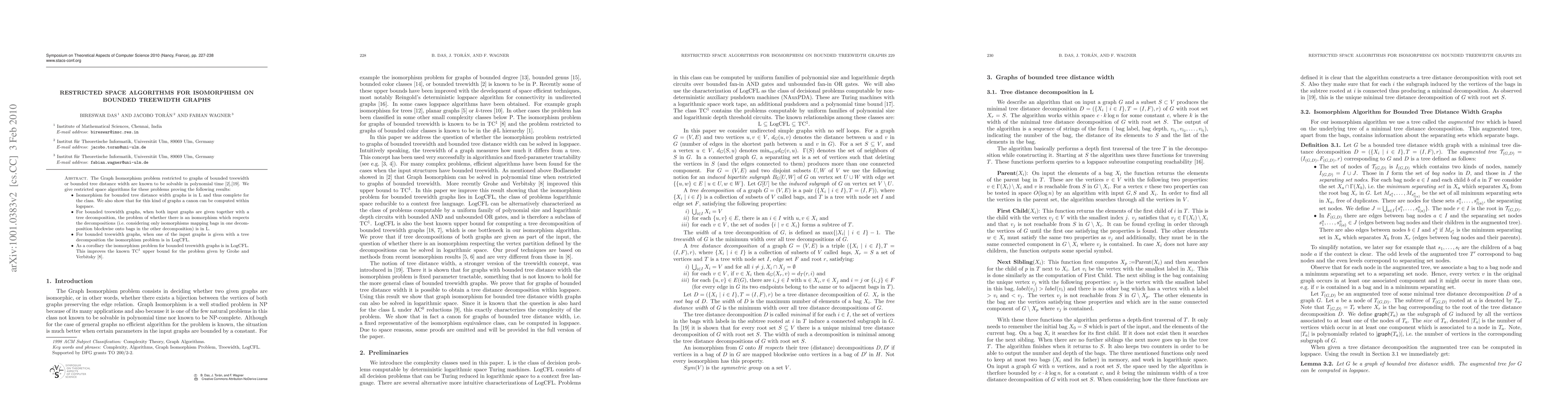 This paper presents restricted space algorithms for the Graph Isomorphism problem on graphs with bounded treewidth or bounded tree distance width, showing that the problem is solvable in polynomial time. The authors demonstrate that isomorphism for bounded tree distance width graphs is in L and that a canon can be computed within logspace. For bounded treewidth graphs, they prove the problem is in L when both graphs and their decompositions are given together, and in LogCFL when only one graph has its decomposition provided.