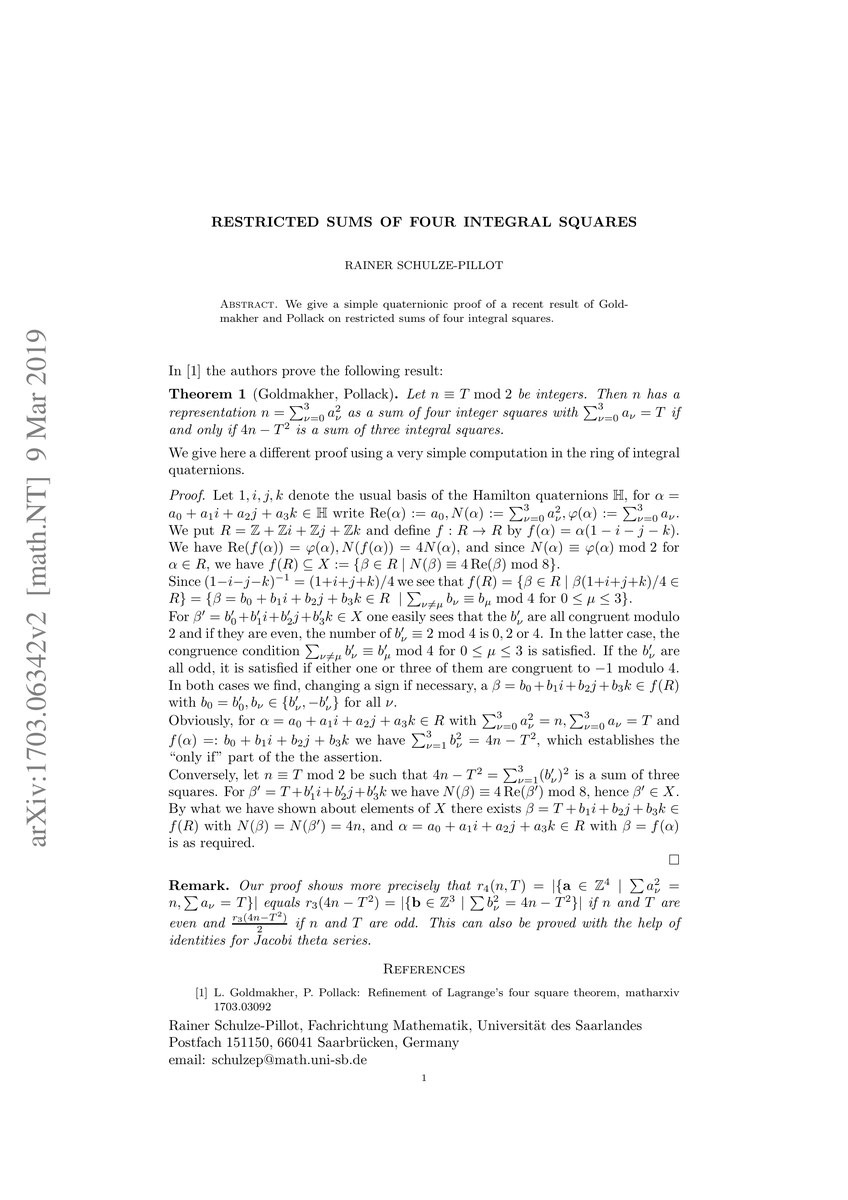 We give a simple quaternionic proof of a recent result of Goldmakher and Pollack on restricted sums of four integral squares.