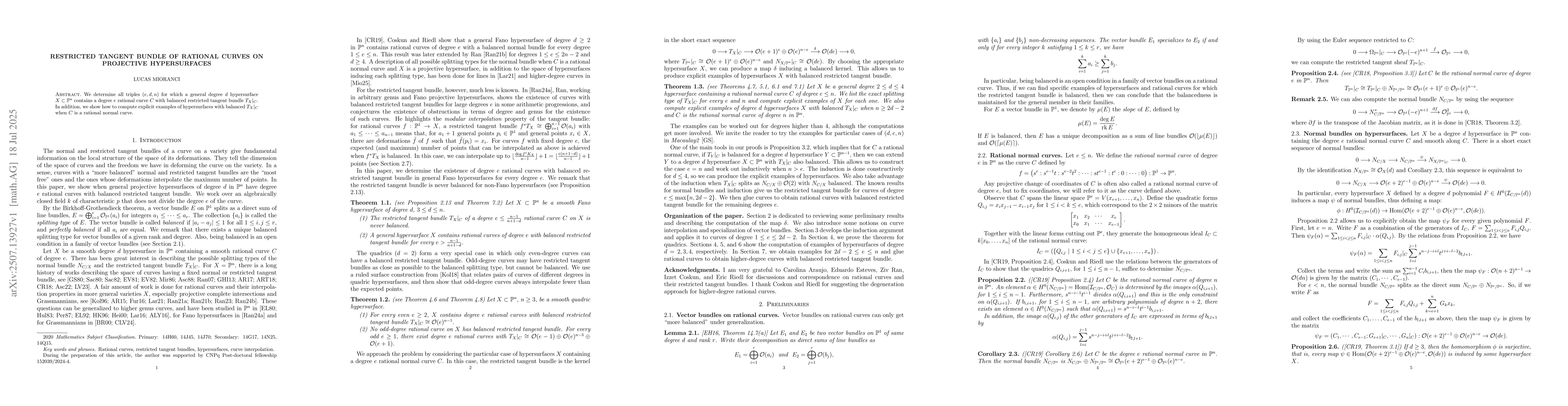 We determine all triples $(e,d,n)$ for which a general degree $d$ hypersurface $X\subset \mathbb{P}^n$ contains a degree $e$ rational curve $C$ with balanced restricted tangent bundle $T_X|_C$. In addition, we show how to compute explicit examples of hypersurfaces with balanced $T_X|_C$ when $C$ is a rational normal curve.