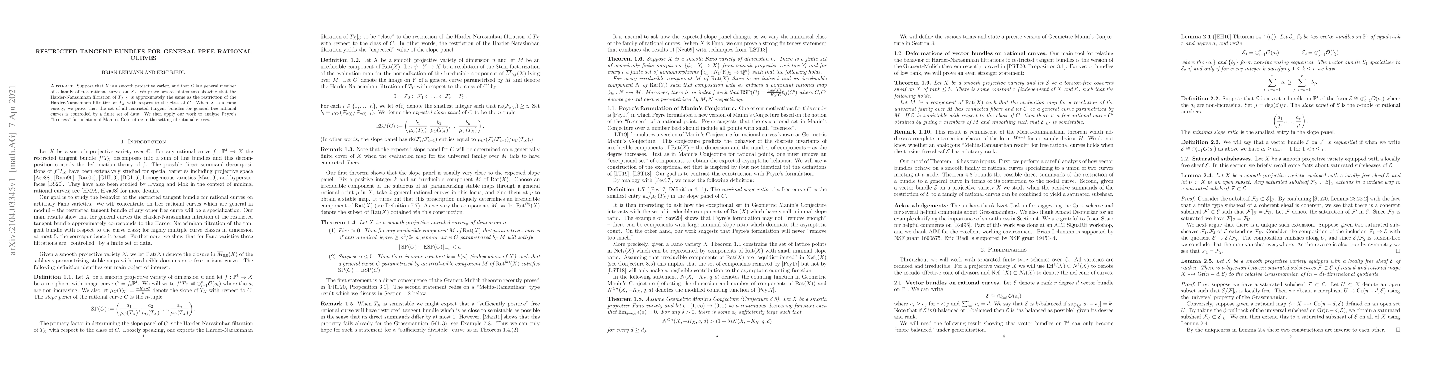 Suppose that $X$ is a smooth projective variety and that $C$ is a general member of a family of free rational curves on $X$. We prove several statements showing that the Harder-Narasimhan filtration of $T_{X}|_{C}$ is approximately the same as the restriction of the Harder-Narasimhan filtration of $T_{X}$ with respect to the class of $C$. When $X$ is a Fano variety, we prove that the set of all restricted tangent bundles for general free rational curves is controlled by a finite set of data. We then apply our work to analyze Peyre's "freeness" formulation of Manin's Conjecture in the setting of rational curves.