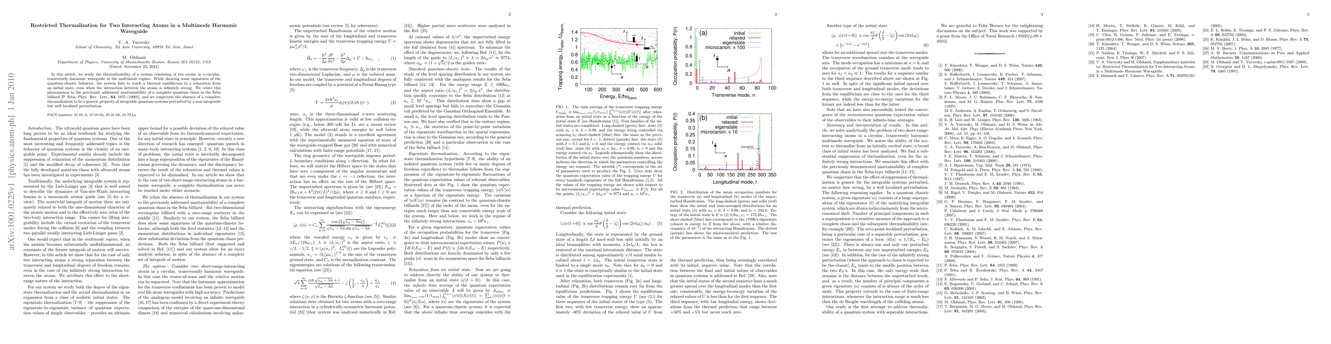 This paper investigates the thermalization behavior of two interacting atoms in a multimode harmonic waveguide, finding that despite strong interactions, the system does not reach thermal equilibrium. The authors link this restricted thermalization to the absence of complete quantum chaos in integrable systems with localized perturbations.