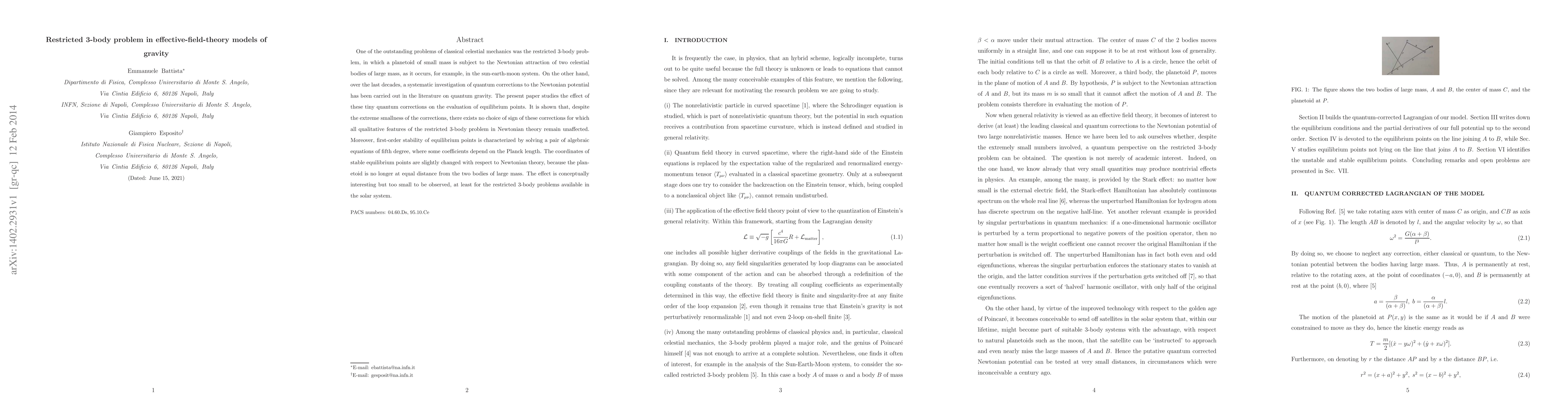 One of the outstanding problems of classical celestial mechanics was the restricted 3-body prob- lem, in which a planetoid of small mass is subject to the Newtonian attraction of two celestial bodies of large mass, as it occurs, for example, in the sun-earth-moon system. On the other hand, over the last decades, a systematic investigation of quantum corrections to the Newtonian potential has been carried out in the literature on quantum gravity. The present paper studies the effect of these tiny quantum corrections on the evaluation of equilibrium points. It is shown that, despite the extreme smallness of the corrections, there exists no choice of sign of these corrections for which all qualitative features of the restricted 3-body problem in Newtonian theory remain unaffected. Moreover, first-order stability of equilibrium points is characterized by solving a pair of algebraic equations of fifth degree, where some coefficients depend on the Planck length. The coordinates of stable equilibrium points are slightly changed with respect to Newtonian theory, because the planetoid is no longer at equal distance from the two bodies of large mass. The effect is conceptually interesting but too small to be observed, at least for the restricted 3-body problems available in the solar system.
