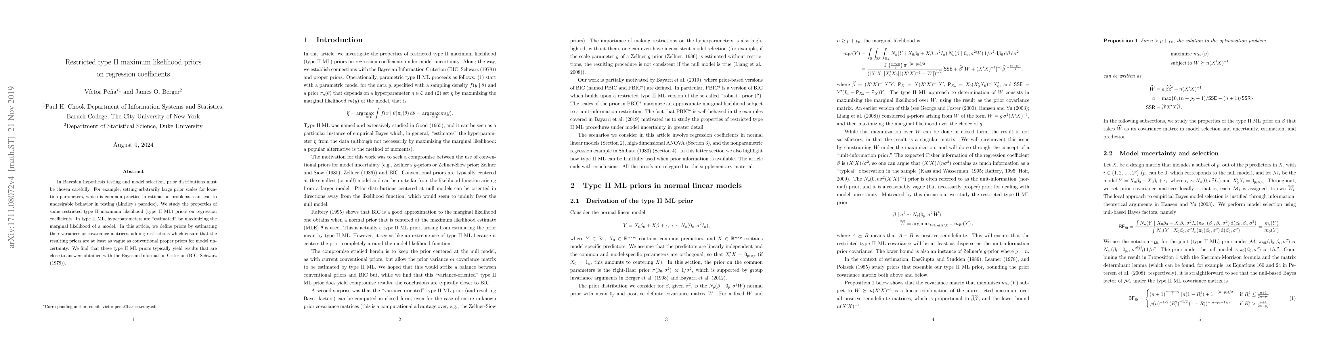 This paper explores the use of restricted type II maximum likelihood priors for regression coefficients to avoid issues like Lindley's paradox in Bayesian hypothesis testing. It defines these priors by estimating hyperparameters to ensure they remain at least as vague as conventional proper priors, often yielding results similar to those obtained with the Bayesian Information Criterion (BIC).