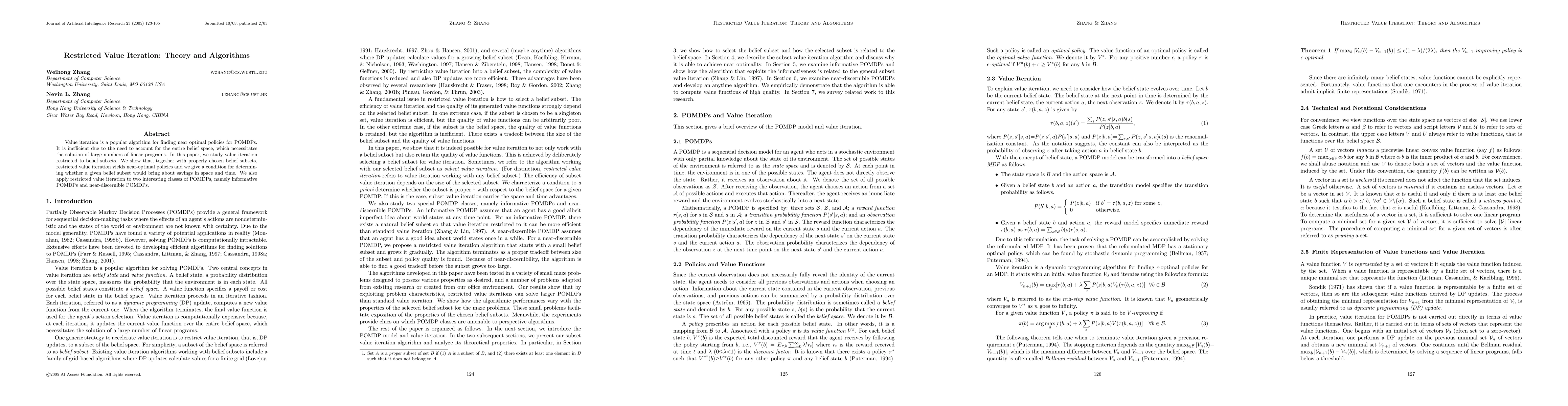 Value iteration is a popular algorithm for finding near optimal policies for POMDPs. It is inefficient due to the need to account for the entire belief space, which necessitates the solution of large numbers of linear programs. In this paper, we study value iteration restricted to belief subsets. We show that, together with properly chosen belief subsets, restricted value iteration yields near-optimal policies and we give a condition for determining whether a given belief subset would bring about savings in space and time. We also apply restricted value iteration to two interesting classes of POMDPs, namely informative POMDPs and near-discernible POMDPs.