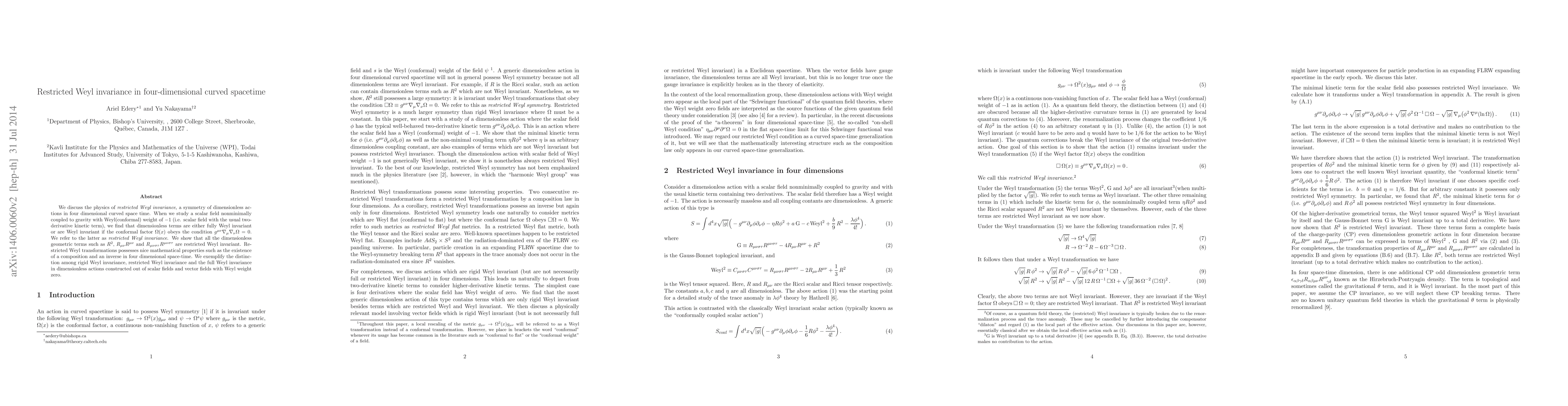 This paper explores restricted Weyl invariance in four-dimensional curved spacetime, identifying conditions under which dimensionless terms remain invariant under specific transformations. It distinguishes between rigid and full Weyl invariance, highlighting that restricted Weyl invariance occurs when the conformal factor satisfies $g^{\mu\nu}\nabla_{\mu}\nabla_{\nu}\Omega=0$.