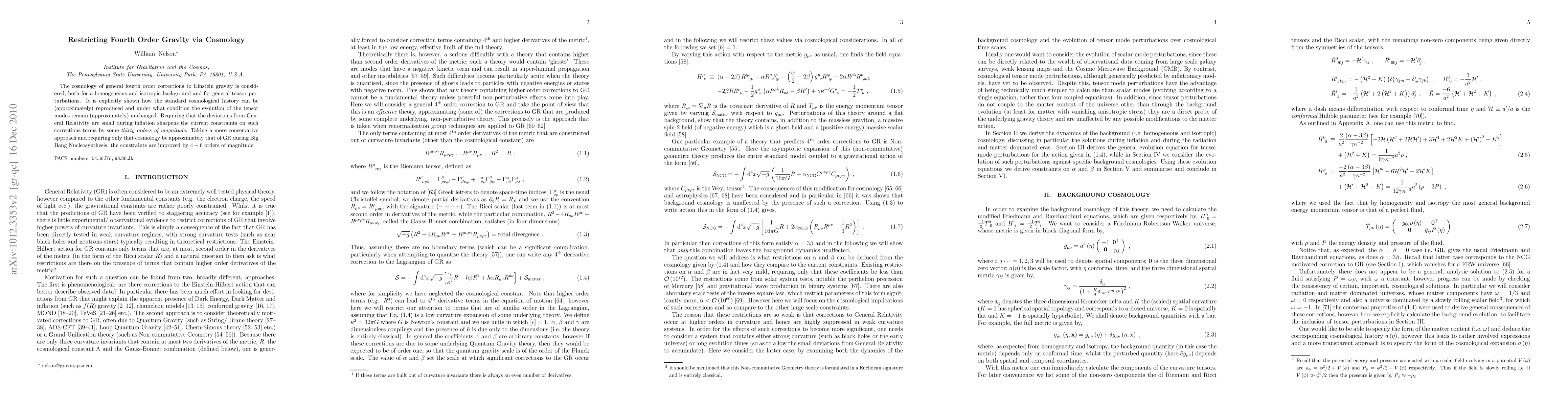 The cosmology of general fourth order corrections to Einstein gravity is considered, both for a homogeneous and isotropic background and for general tensor perturbations. It is explicitly shown how the standard cosmological history can be (approximately) reproduced and under what condition the evolution of the tensor modes remain (approximately) unchanged. Requiring that the deviations from General Relativity are small during inflation sharpens the current constraints on such corrections terms by some thirty orders of magnitude. Taking a more conservative approach and requiring only that cosmology be approximately that of GR during Big Bang Nucleosynthesis, the constraints are improved by 4 - 6 orders of magnitude.