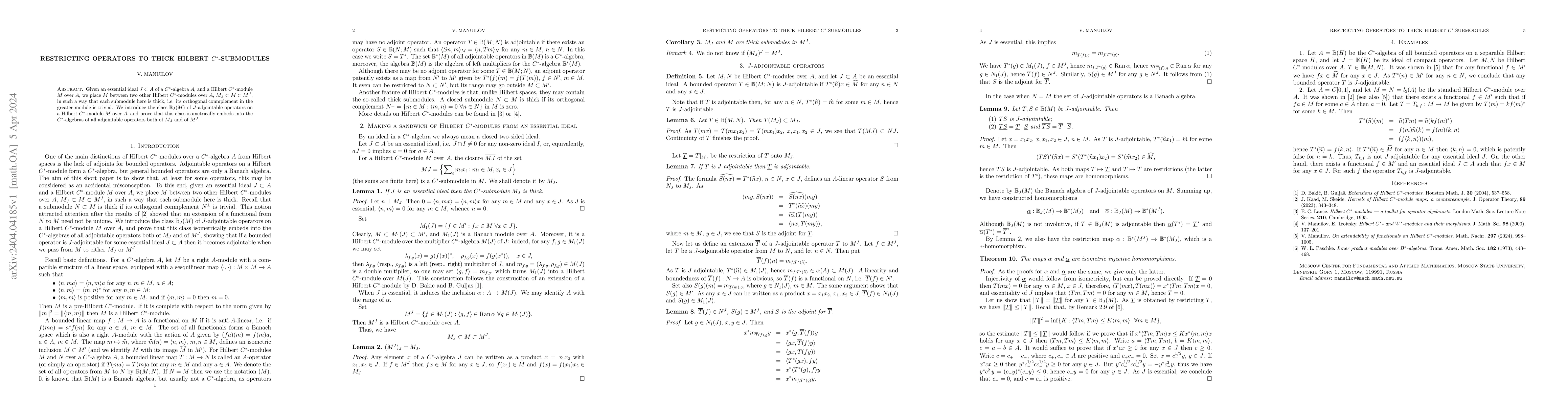 Given an essential ideal $J\subset A$ of a C*-algebra $A$, and a Hilbert C*-module $M$ over $A$, we place $M$ between two other Hilbert C*-modules over $A$, $M_J\subset M\subset M^J$, in such a way that each submodule here is thick, i.e. its orthogonal conmplement in the greater module is trivial. We introduce the class $\mathbb B_J(M)$ of $J$-adjointable operators on a Hilbert C*-module $M$ over $A$, and prove that this class isometrically embeds into the C*-algebras of all adjointable operators both of $M_J$ and of $M^J$.