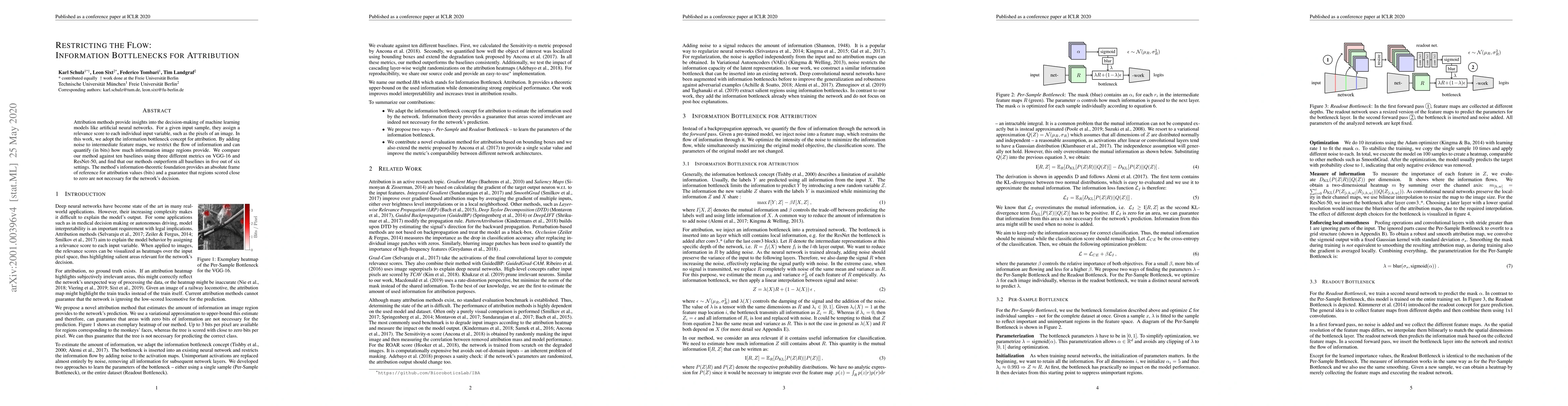 Attribution methods provide insights into the decision-making of machine learning models like artificial neural networks. For a given input sample, they assign a relevance score to each individual input variable, such as the pixels of an image. In this work we adapt the information bottleneck concept for attribution. By adding noise to intermediate feature maps we restrict the flow of information and can quantify (in bits) how much information image regions provide. We compare our method against ten baselines using three different metrics on VGG-16 and ResNet-50, and find that our methods outperform all baselines in five out of six settings. The method's information-theoretic foundation provides an absolute frame of reference for attribution values (bits) and a guarantee that regions scored close to zero are not necessary for the network's decision. For reviews: https://openreview.net/forum?id=S1xWh1rYwB For code: https://github.com/BioroboticsLab/IBA