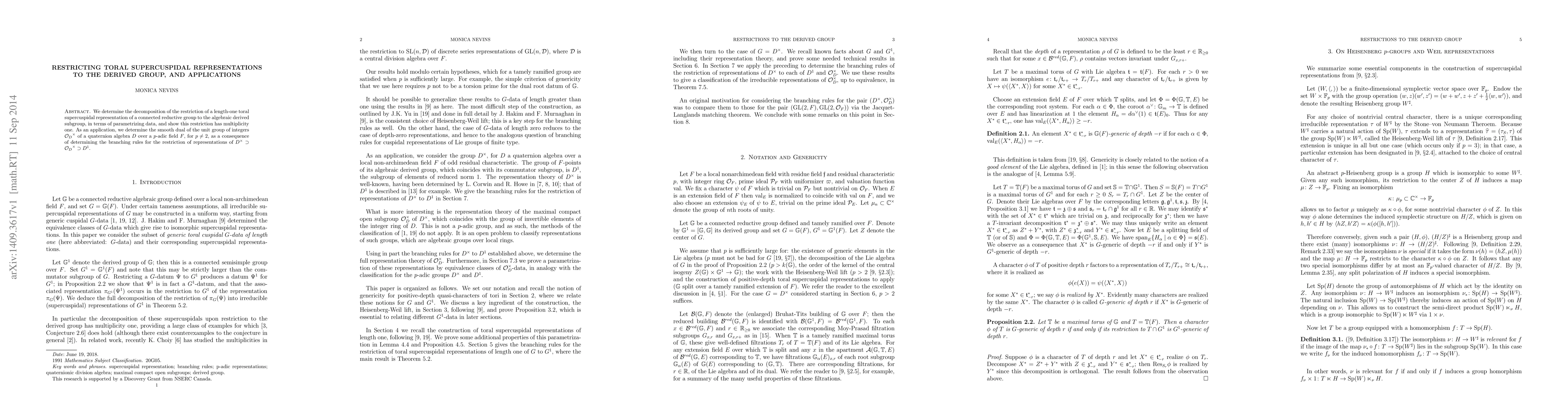 This research paper determines how toral supercuspidal representations of connected reductive groups decompose when restricted to their derived subgroups, showing this restriction has multiplicity one. It also applies this finding to identify the smooth dual of the unit group of a quaternion algebra's integer ring over a p-adic field, for odd p.